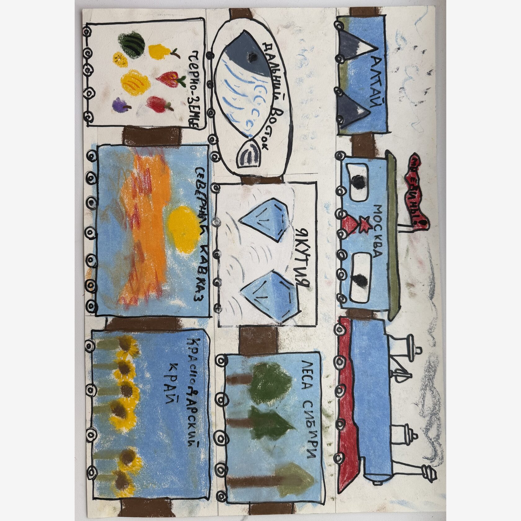 Работа выполнена учеником 5 класса ГБОУ "Школа № 1950". Локомотив - это флаг России, а вагончики - народы и регионы нашей страны.