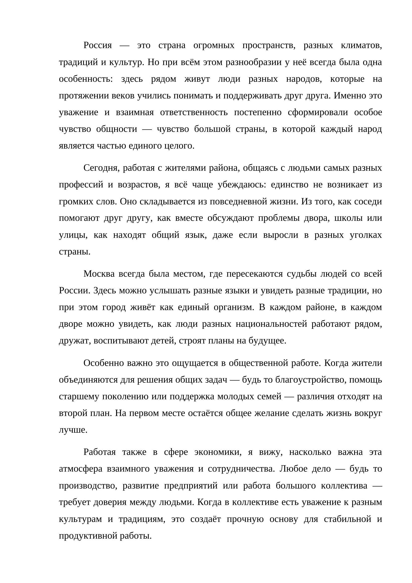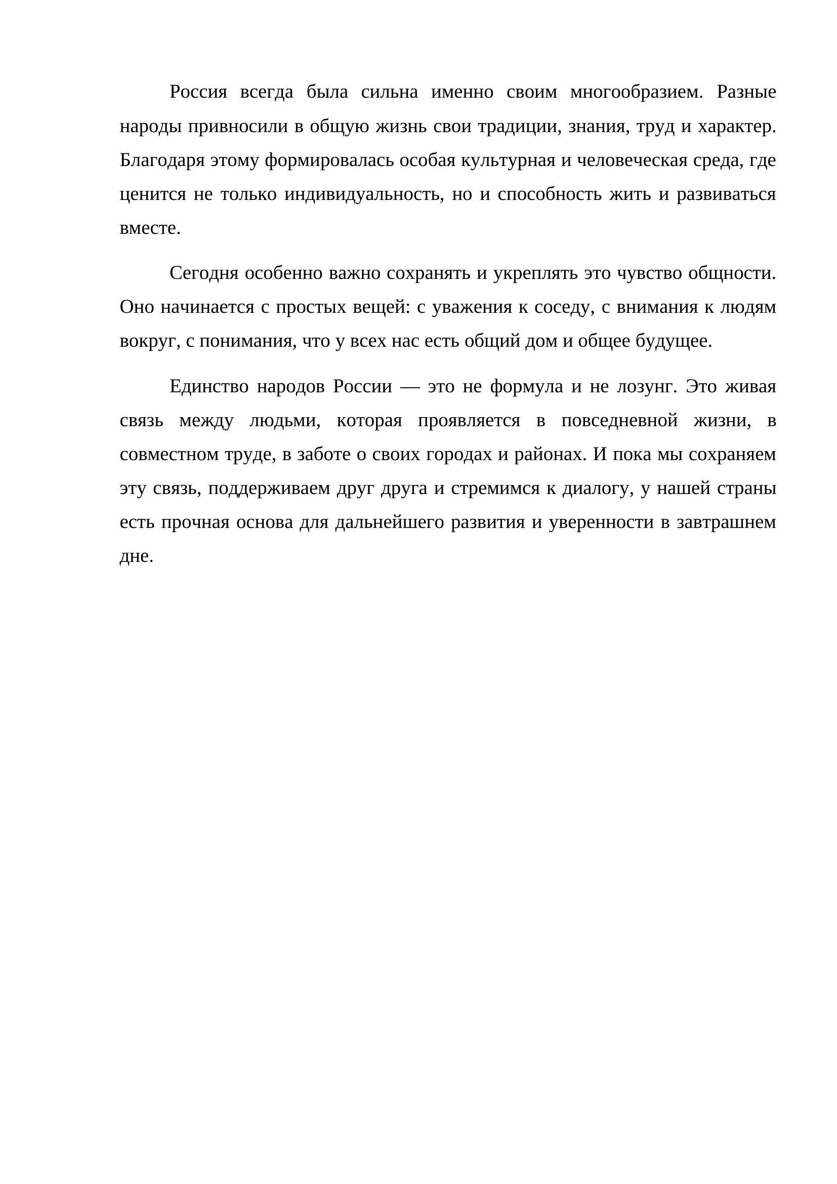 Публицистическая проза, посвящённая теме единства народов России и значению взаимного уважения между людьми разных культур и традиций. В тексте раскрывается мысль о том, что настоящая общность страны формируется не громкими лозунгами, а повседневной жизнью людей — их трудом, взаимопомощью и совместным стремлением к развитию.