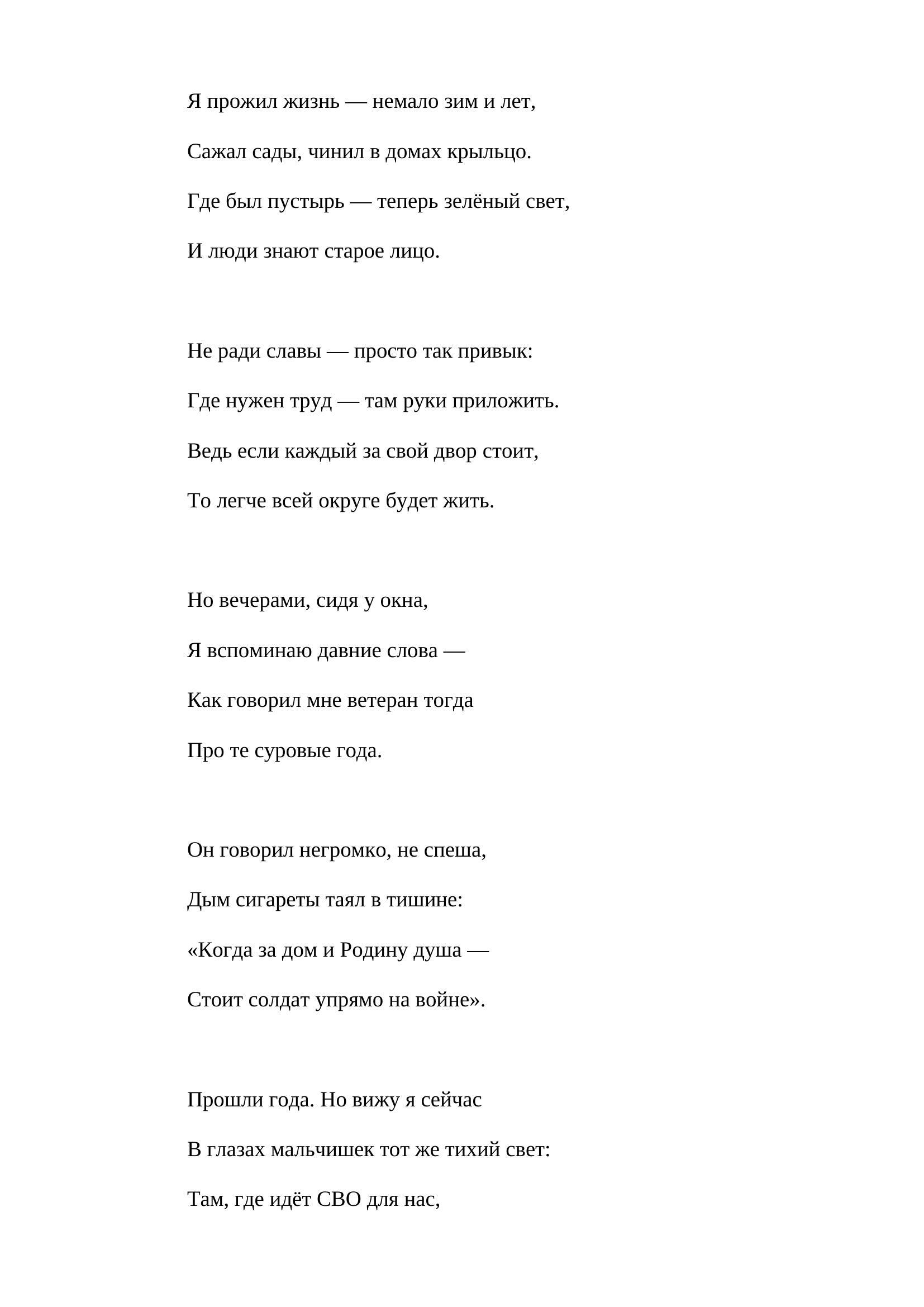 Лирическое стихотворение, написанное от лица пожилого человека, посвятившего свою жизнь служению людям и развитию своего района. Герой произведения — человек труда и общественного дела: он строил, помогал соседям, благоустраивал улицы и годами заботился о месте, где живёт.