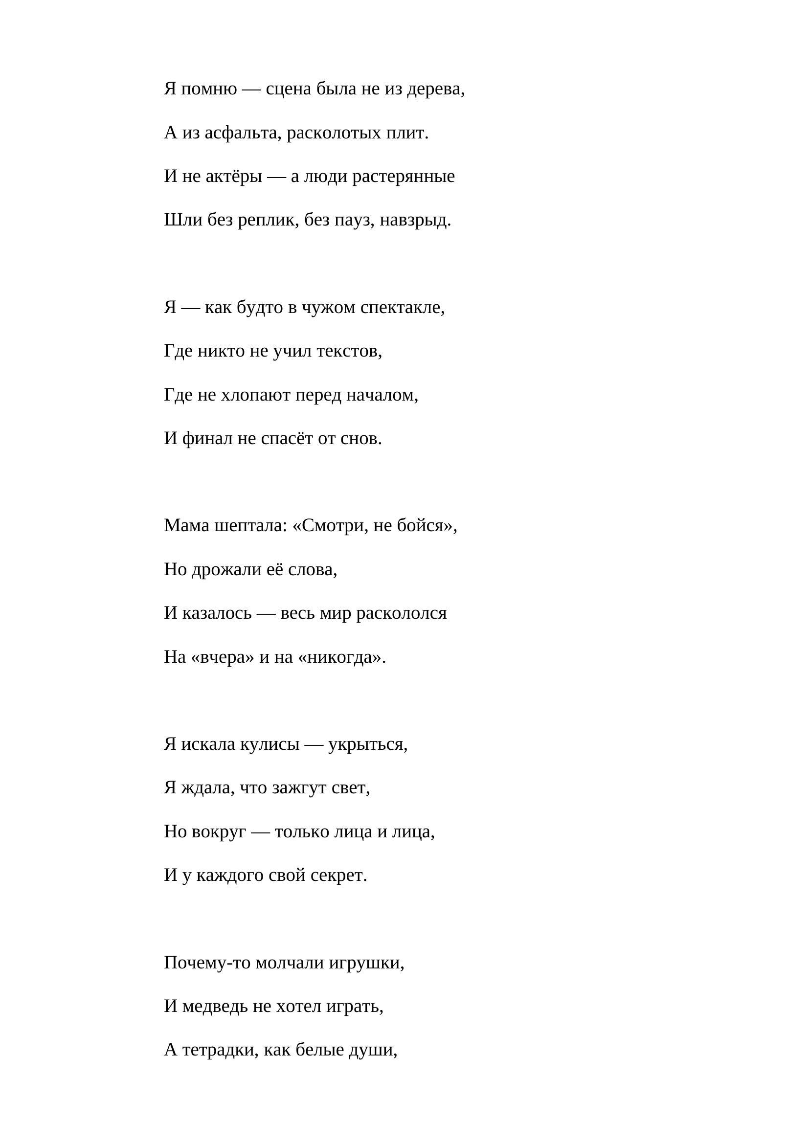 Стихотворение передаёт войну через взгляд ребёнка, для которого мир вдруг превращается в страшный и непонятный спектакль. Здесь нет выученных ролей, аплодисментов и режиссёра, который может остановить действие. Асфальт становится сценой, растерянные люди — актёрами, а детские игрушки и тетрадки молча наблюдают за происходящим. Через театральные образы раскрывается хрупкость детского восприятия и боль утраченного детства. Это история о моменте, когда ребёнок впервые понимает: у этой пьесы нет антракта, и жизнь уже никогда не будет прежней.