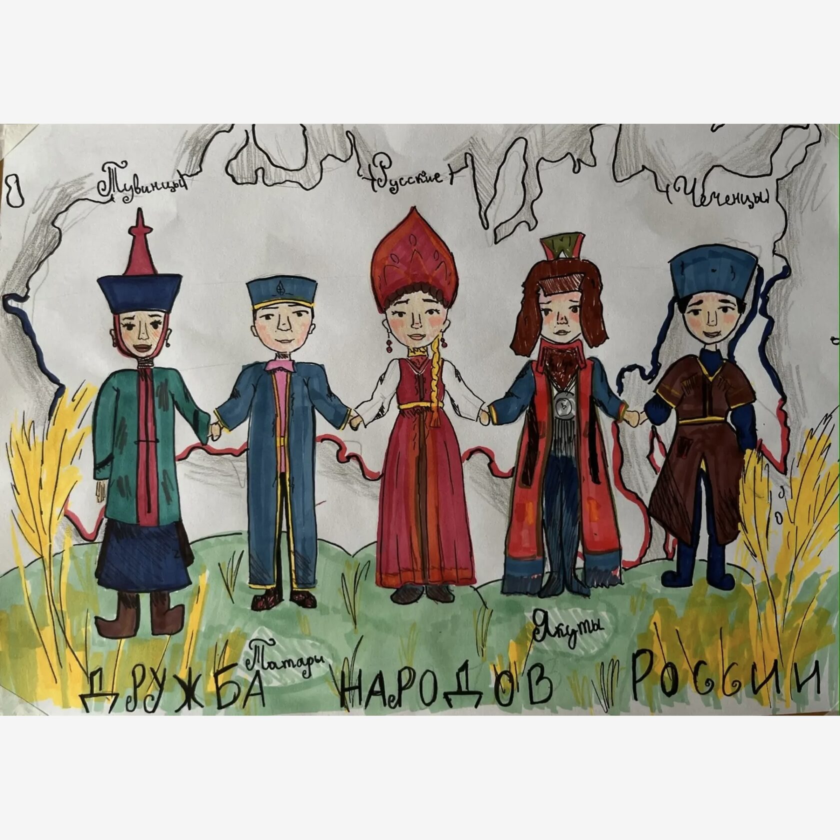 Я нарисовала разных людей, живущих в нашей огромной стране, и все это --русские люди, потому что Россия -- многонациональная страна и мы все братья!