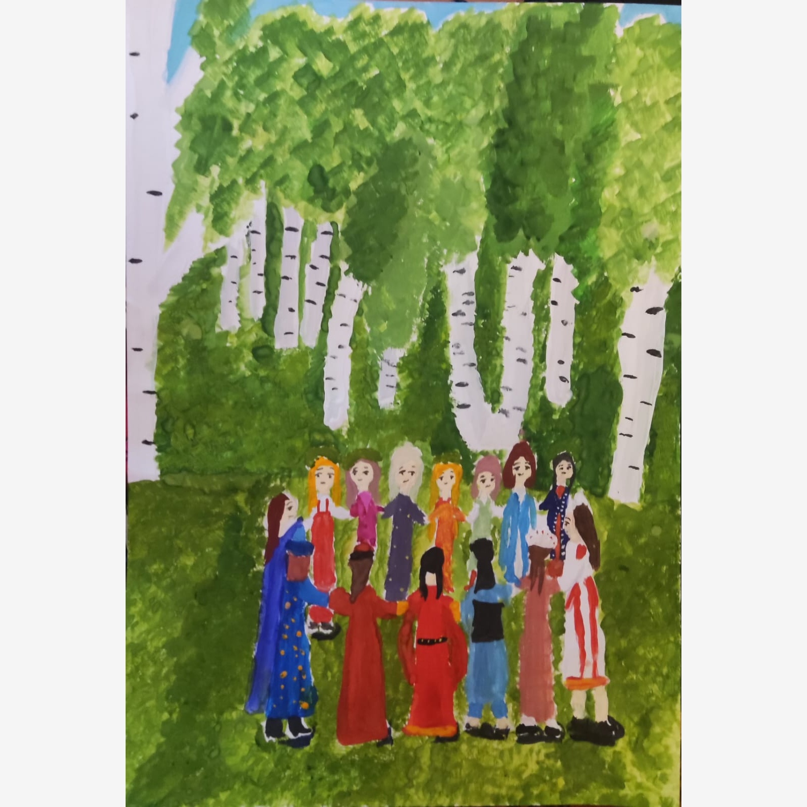 На рисунке изображён традиционный русский хоровод — один из самых древних и символичных народных танцев. На зелёной лужайке, залитой солнцем, кружится яркий хоровод — девушки разных национальностей, взявшись за руки, плавно движутся по кругу. Их лица светятся радостью, а глаза искрятся задором. В этом танце — вся палитра мира: разноцветные костюмы, расшитые национальными узорами, переливаются на солнце, словно живые картины. Акварель, А4.
