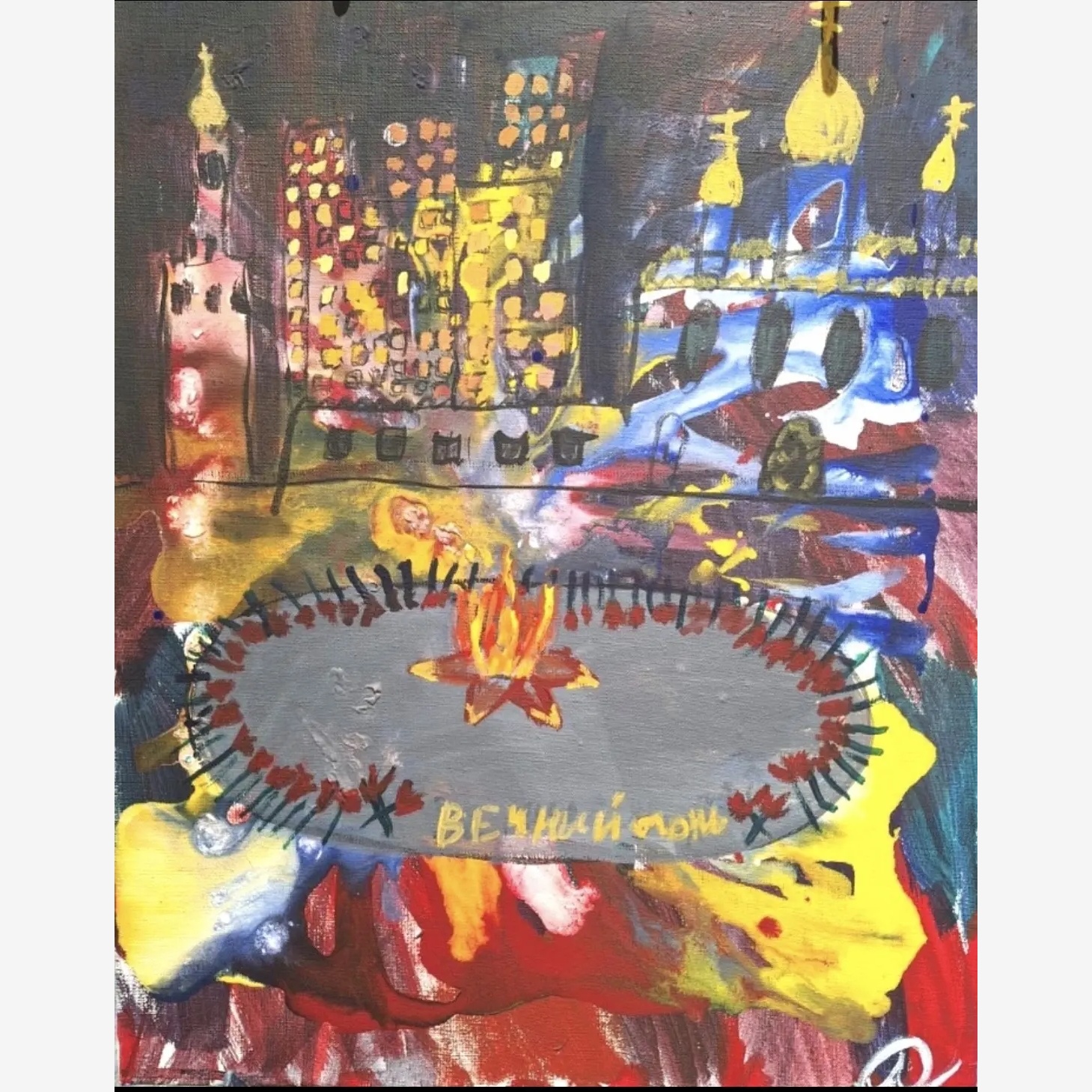 «На моей картине, я старалась изобразить, как у нас помнят и почитают наших героев.Вечный Огонь-это наш символ памяти и героизма, и, как Вечная Память- Слава нашим Героям.