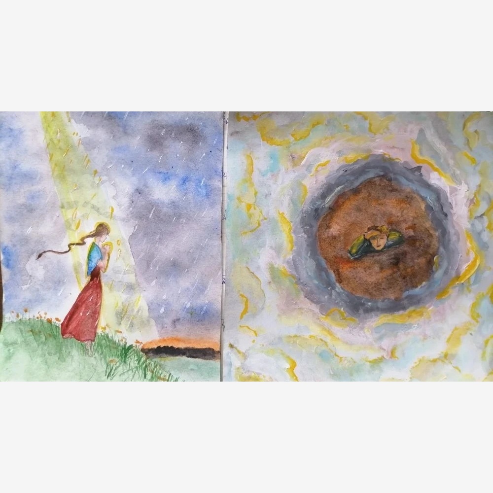 работа представляет собой 2 рисунка, объединенных единой идеей: девушка обращается к богу, сохраняет и оберегает своей молитвой парня в окопе