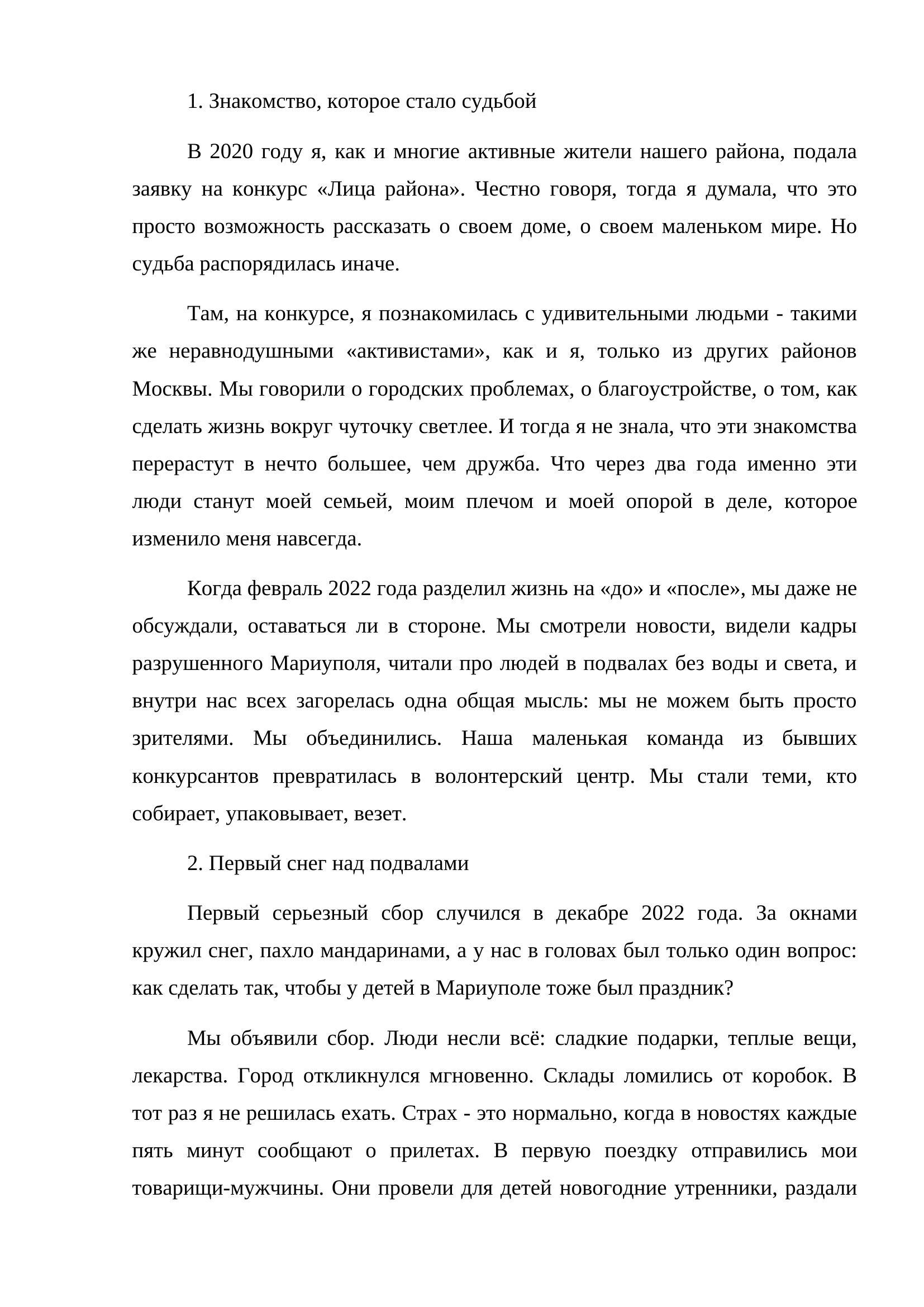 Это история о том, как случайное знакомство на городском конкурсе превратилось в настоящее братство и привело к делу, которое изменило жизнь. После событий февраля 2022 года группа обычных жителей Москвы объединилась, чтобы помогать тем, кто оказался в зоне войны.