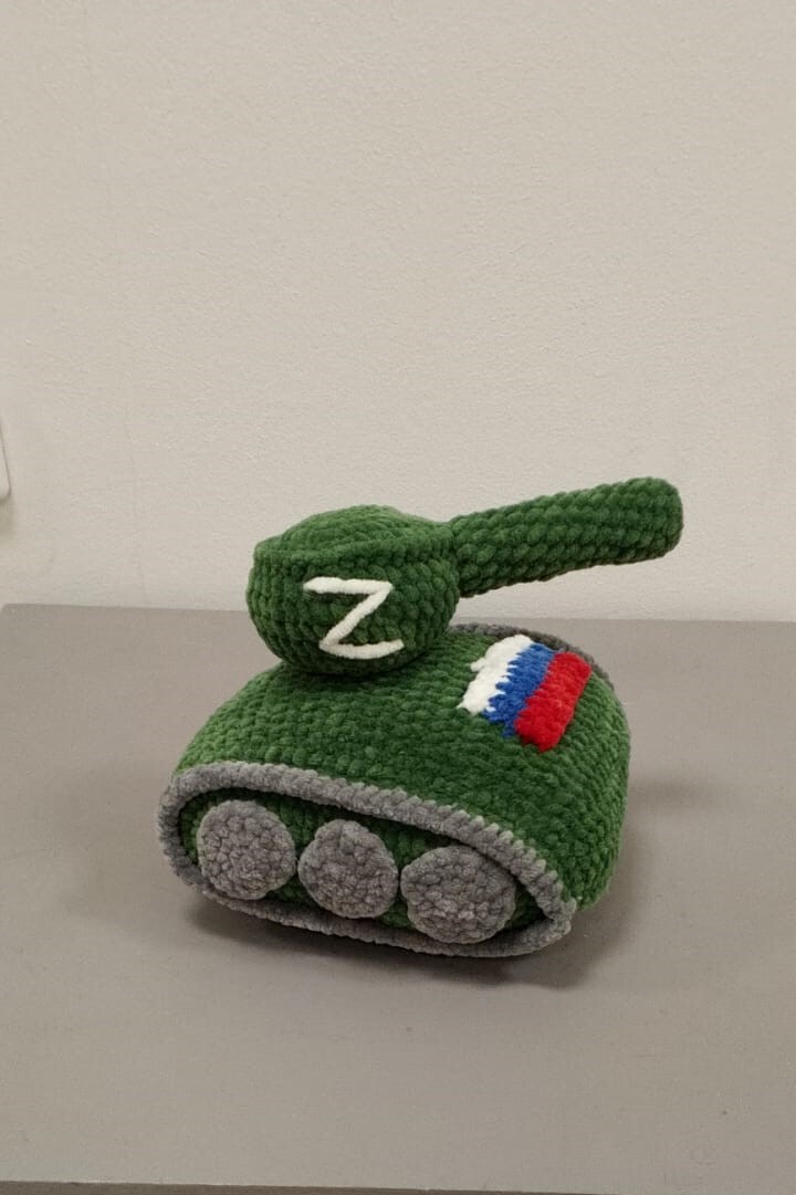 Ручная работа, выполнена крючком, из плюшевой пряжи.Башня на танке крутится.