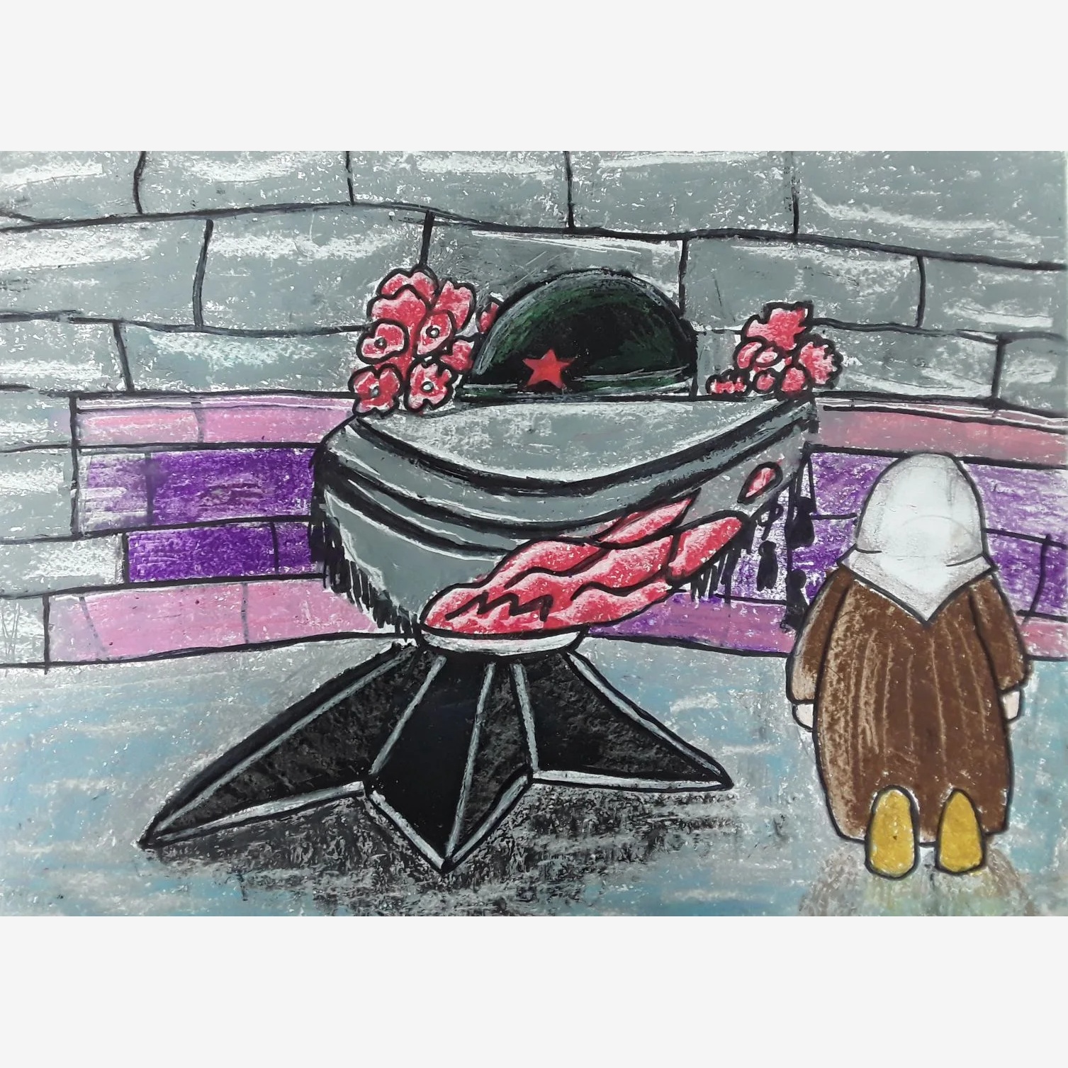 Управление "Изобразительного искусства". На картине изображена бабушка, вставшая на колени перед Могилой Неизвестного солдата и Вечным Огнем. Она вспоминает всех павших в войне родственников и близких. Работа выполнена в приглушенных тонах, что усиливает чувство скорби, акцентами выделяются только красные цветы и огонь.