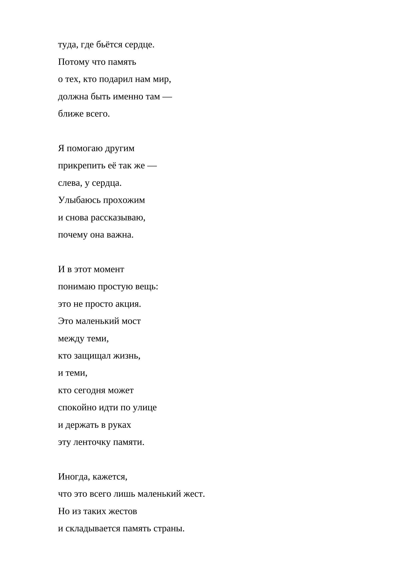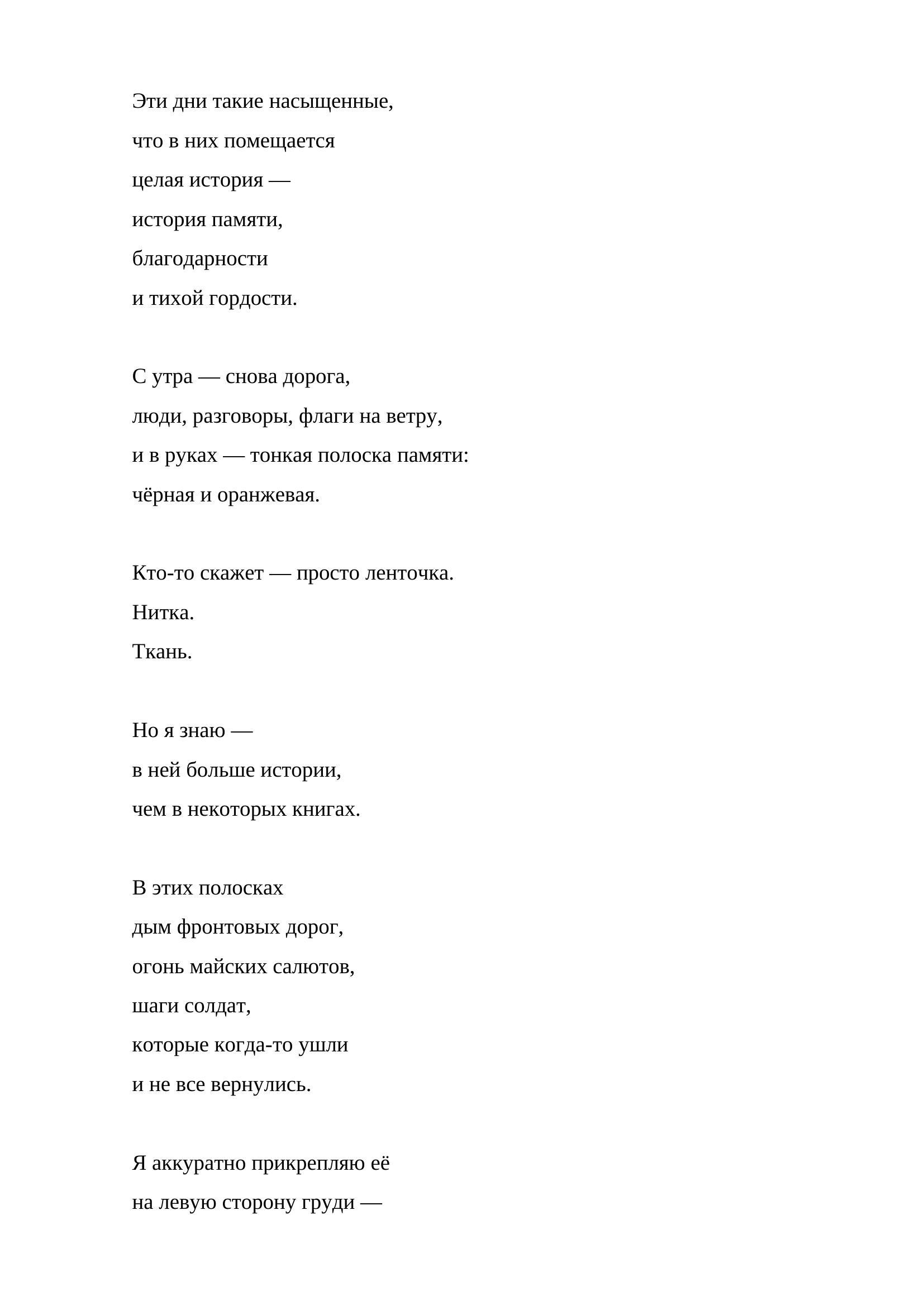 Это прозаическое произведение посвящено сохранению исторической памяти и уважению к подвигу поколения Победы. Через личные впечатления автора от участия в памятной акции раскрывается символическое значение чёрно-оранжевой ленточки как знака благодарности и связи поколений.