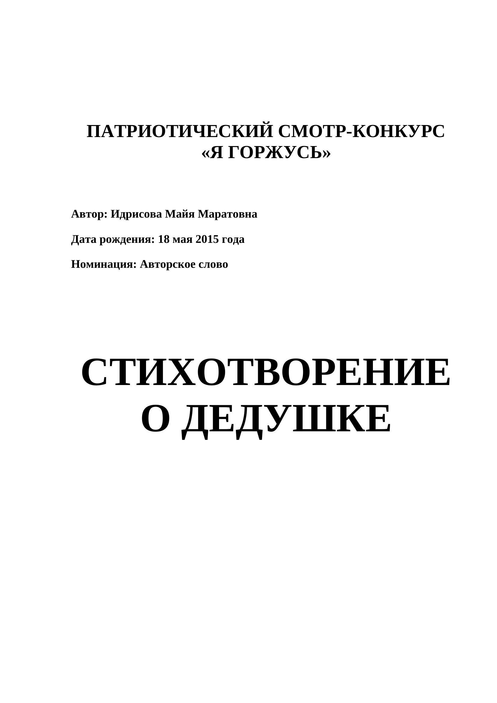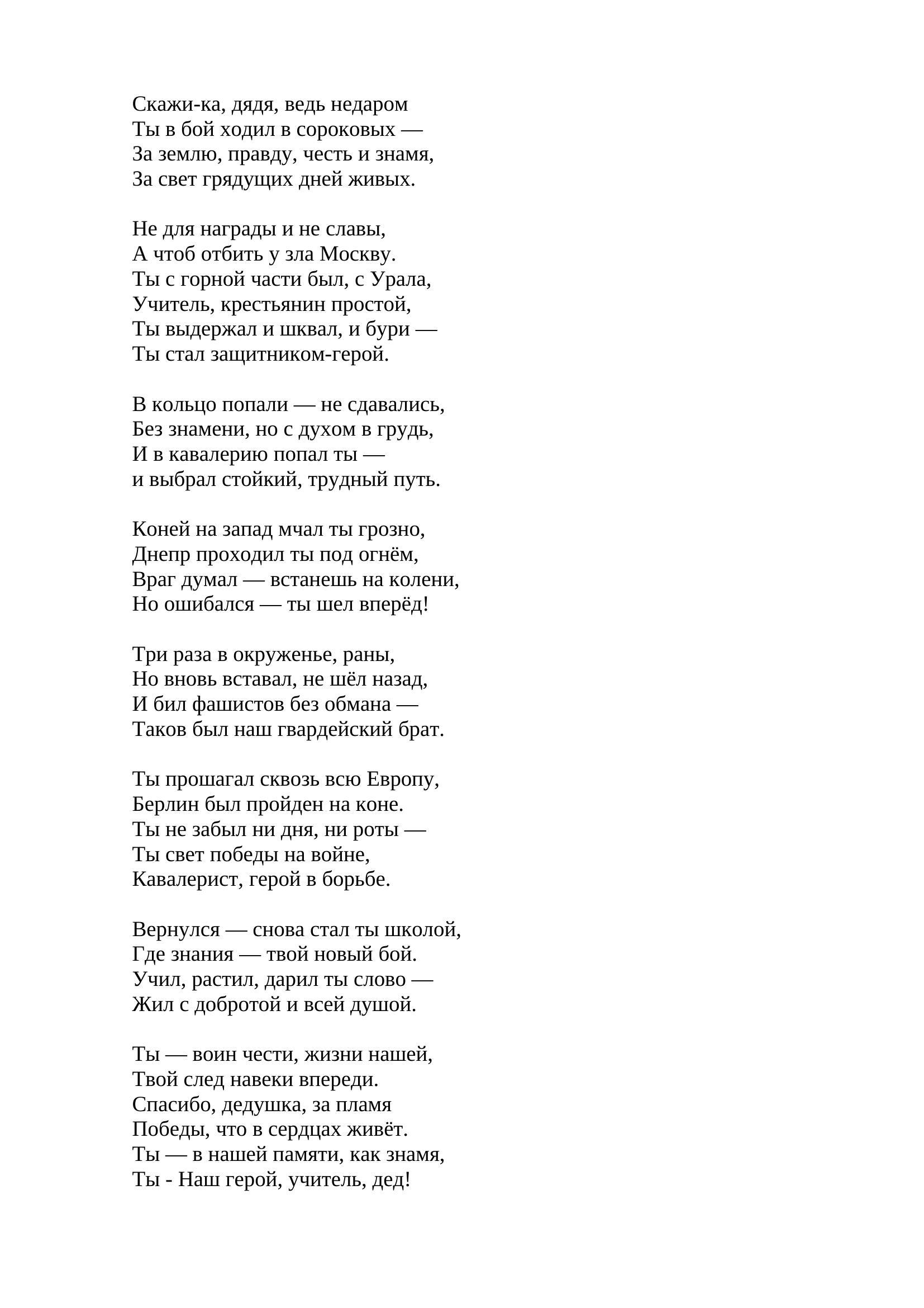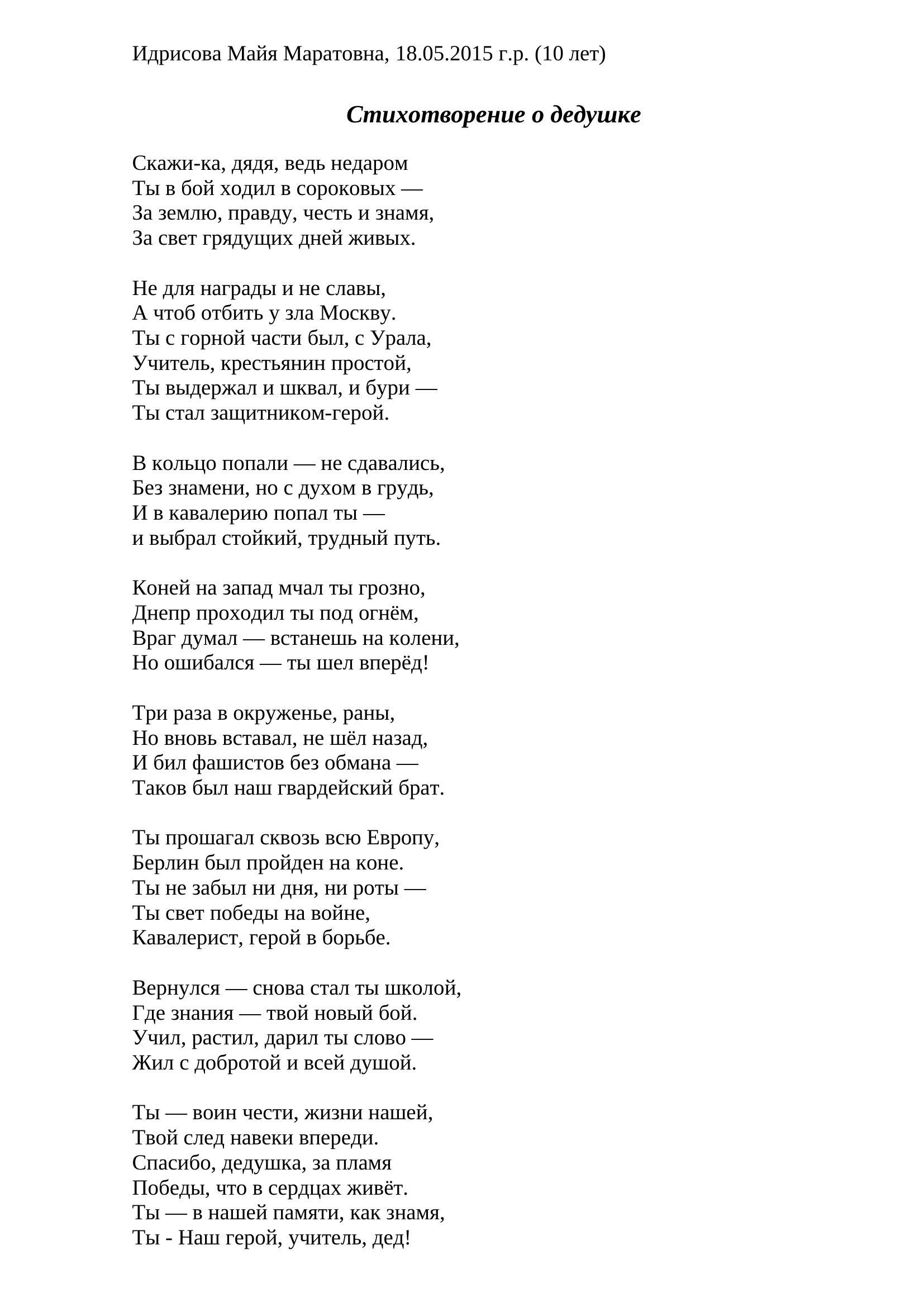 Библиотека № 4 имени Е.А. Фурцевой. Я сочинила стихотворение о моем дедушке, потому что он — настоящий герой. Он прошел всю войну и остался сильным и мудрым человеком. Мой дедушка — герой Великой Отечественной войны и наш семейный защитник. Он дожил до 106 лет, и мы очень гордимся им. Для меня его история — пример мужества, стойкости и любви к Родине. Я хочу, чтобы все знали о его подвигах и уважали героев нашей страны.