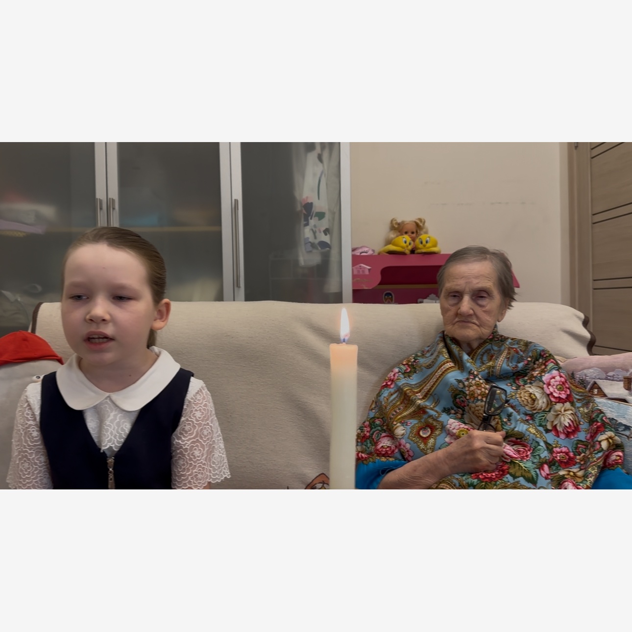 Чтение стихотворения о войне, рядом слушает 89- летняя бабушка, которая помнит ужас и невзгоды, горит памятная свеча