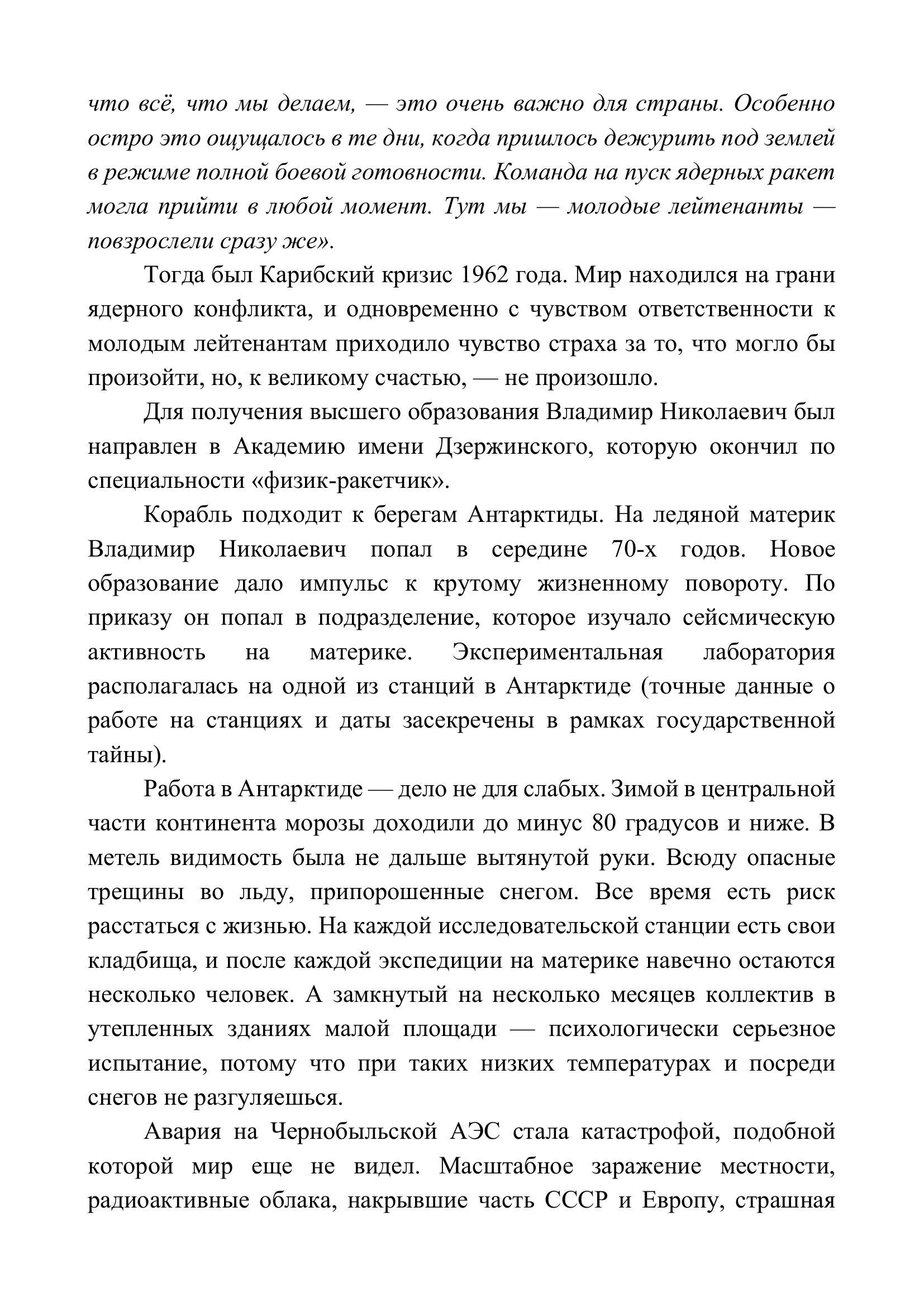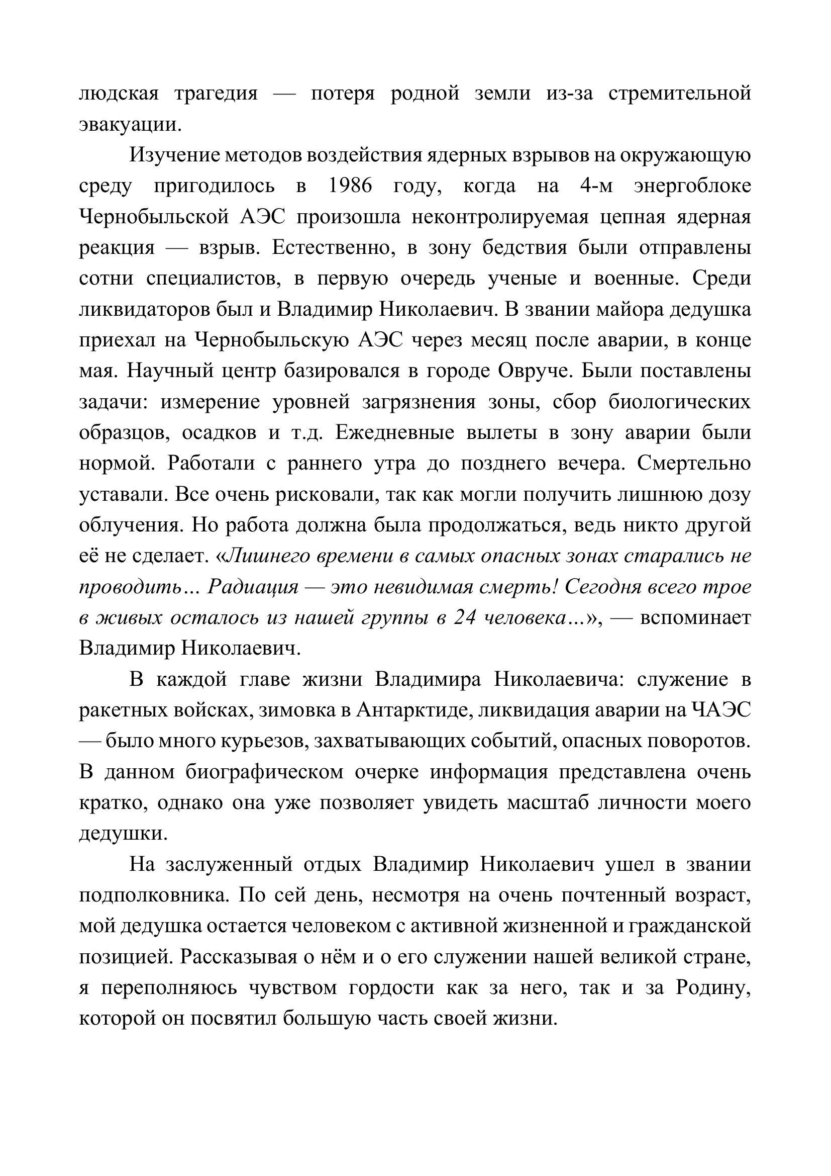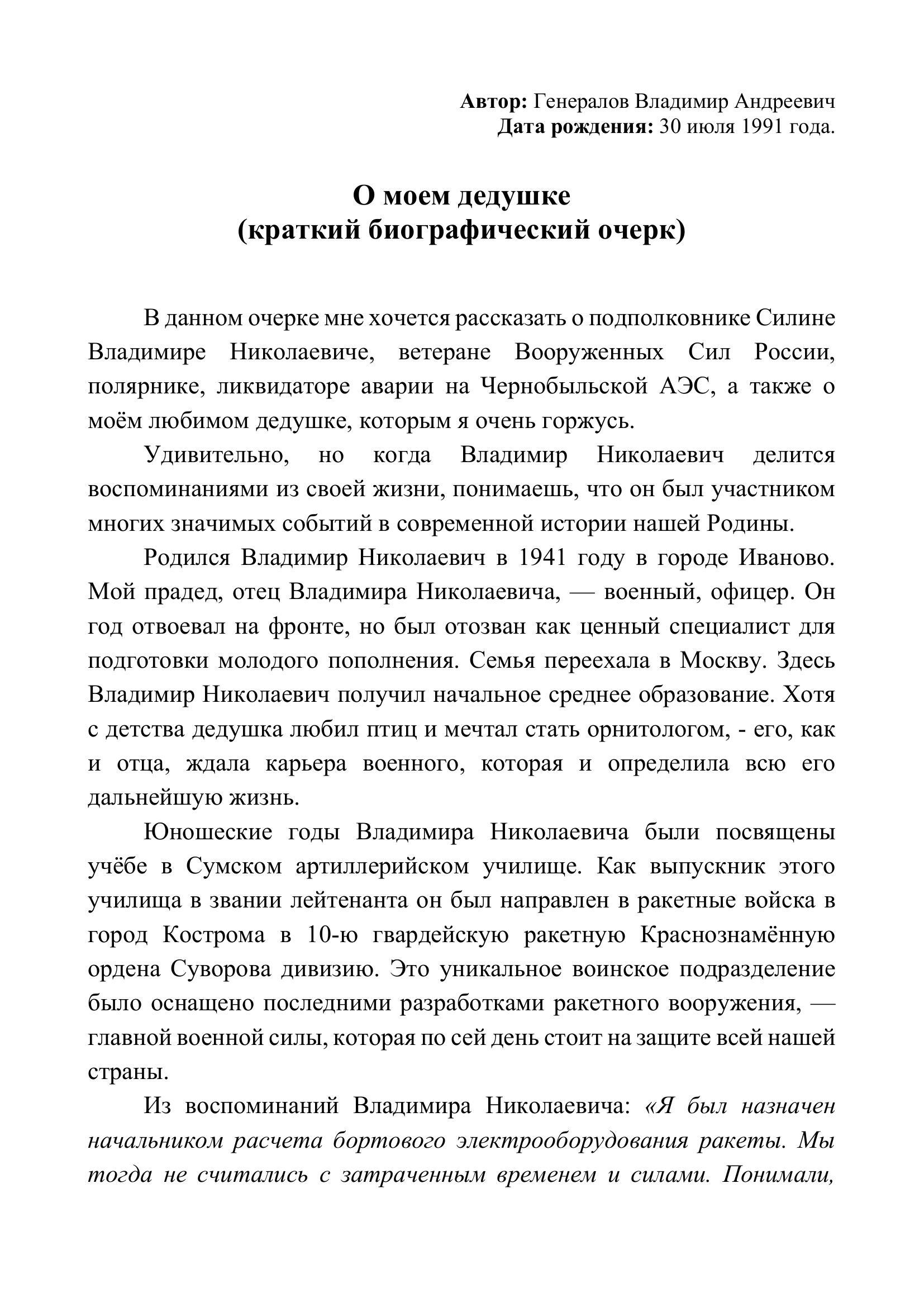 В данном очерке мне хочется рассказать о подполковнике Силине Владимире Николаевиче, ветеране Вооруженных Сил России, полярнике, ликвидаторе аварии на Чернобыльской АЭС. Примечание - в предыдущем варианте отправленной работы опечатки.