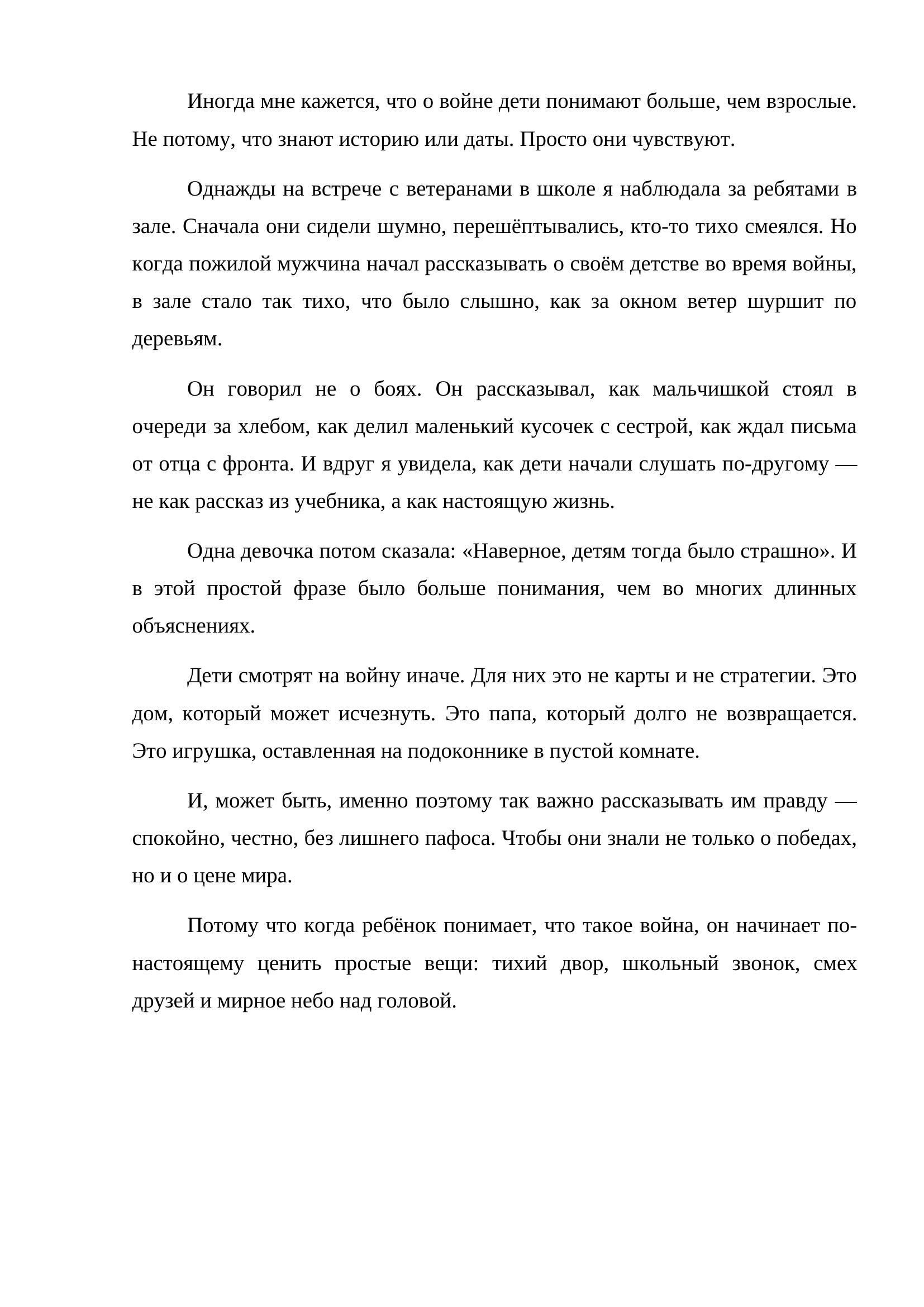 Небольшая прозаическая зарисовка о школьной встрече с ветераном, где обычный рассказ о детстве во время войны заставляет детей по-новому взглянуть на историю. Через тихие детали — очередь за хлебом, ожидание письма с фронта, страх и надежду — дети начинают воспринимать войну не как страницы учебника, а как человеческую жизнь. Текст размышляет о том, почему именно детское сердце иногда чувствует правду глубже слов и как понимание прошлого помогает ценить самое простое и важное — мирную жизнь.