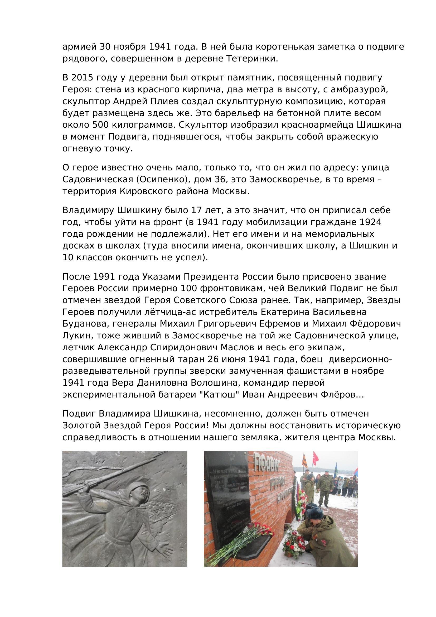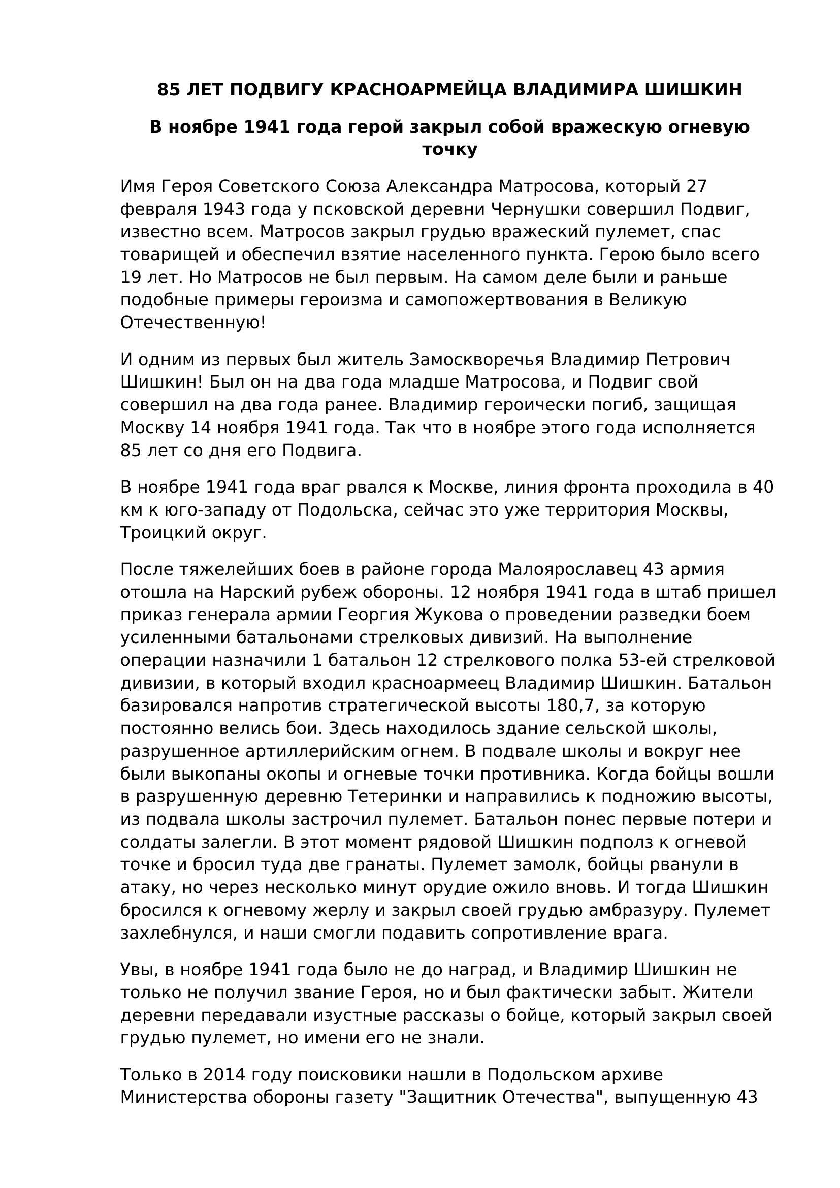 Очер о подвиге Владимира Петровича Шишкина, жителя района Замоскворечье города Москвы., закрывшего грудью амбразуру вражеского пулемета 14 ноября 1941 года.