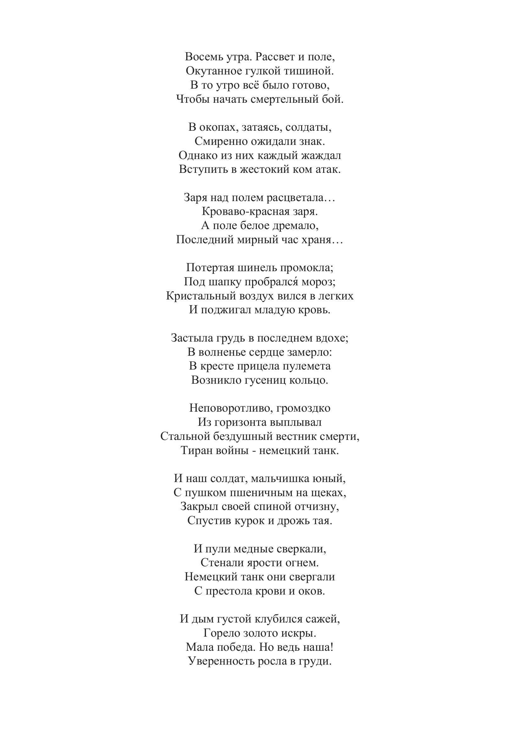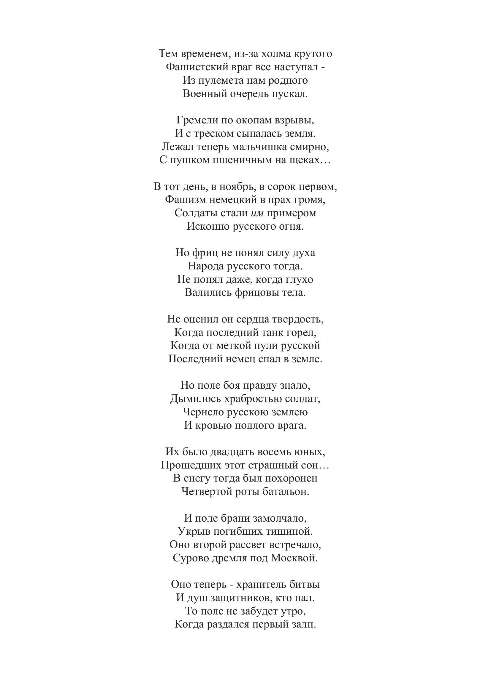 Стихотворение посвящено подвигу героев-панфиловцев в годы Великой Отечественной войны. В произведении передаётся напряжённая и воинственная обстановка события. Восхваляется сила духа русских солдат, в том числе смелость совсем юных ребят, которые во время войны, не задумываясь, покидали дом и вставали на защиту Родины, отдавая за это свои жизни.