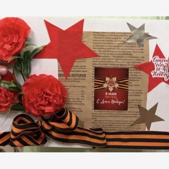 Красивая поздравительная открытка своими руками с использованием материалов: старая газета, цветная бумага, салфетки, георгиевская лента