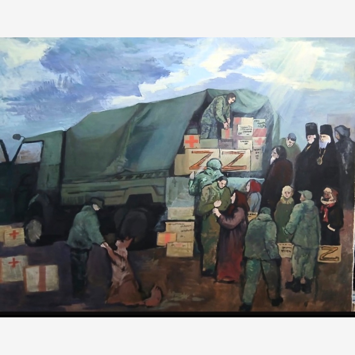 В своей картине, я попыталась показать, что милосердие живо, и продолжает жить в сердцах русских людей.Оказание помощи населению Донбасса,Курской области и Белгорада.Представители всех национальностей и слоев общества «сплотились в единый кулак», чтобы дать отпор зловейщему врагу.Победа близка!Своих не бросаем! Холст,масло.