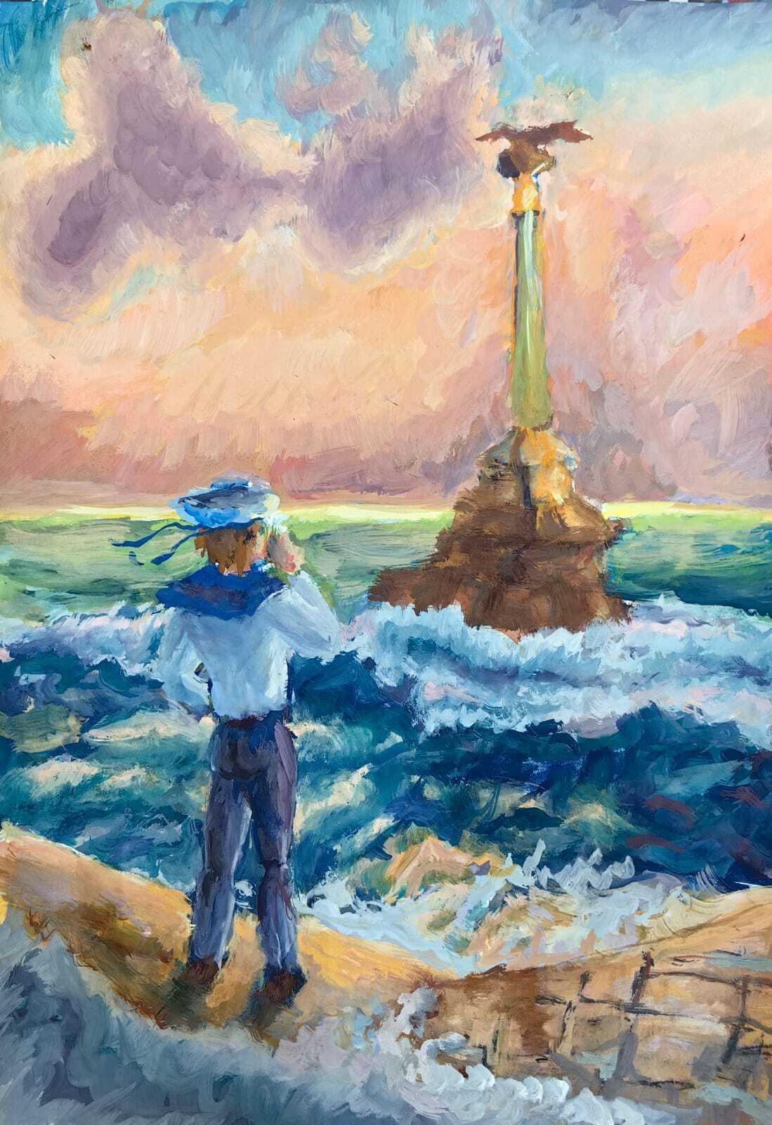 Исполнение лист А4 и Гуашь. Севастополь, юноша смотрит на памятник затопленным кораблям, отдавая им честь, и сам мечтает стать моряком.