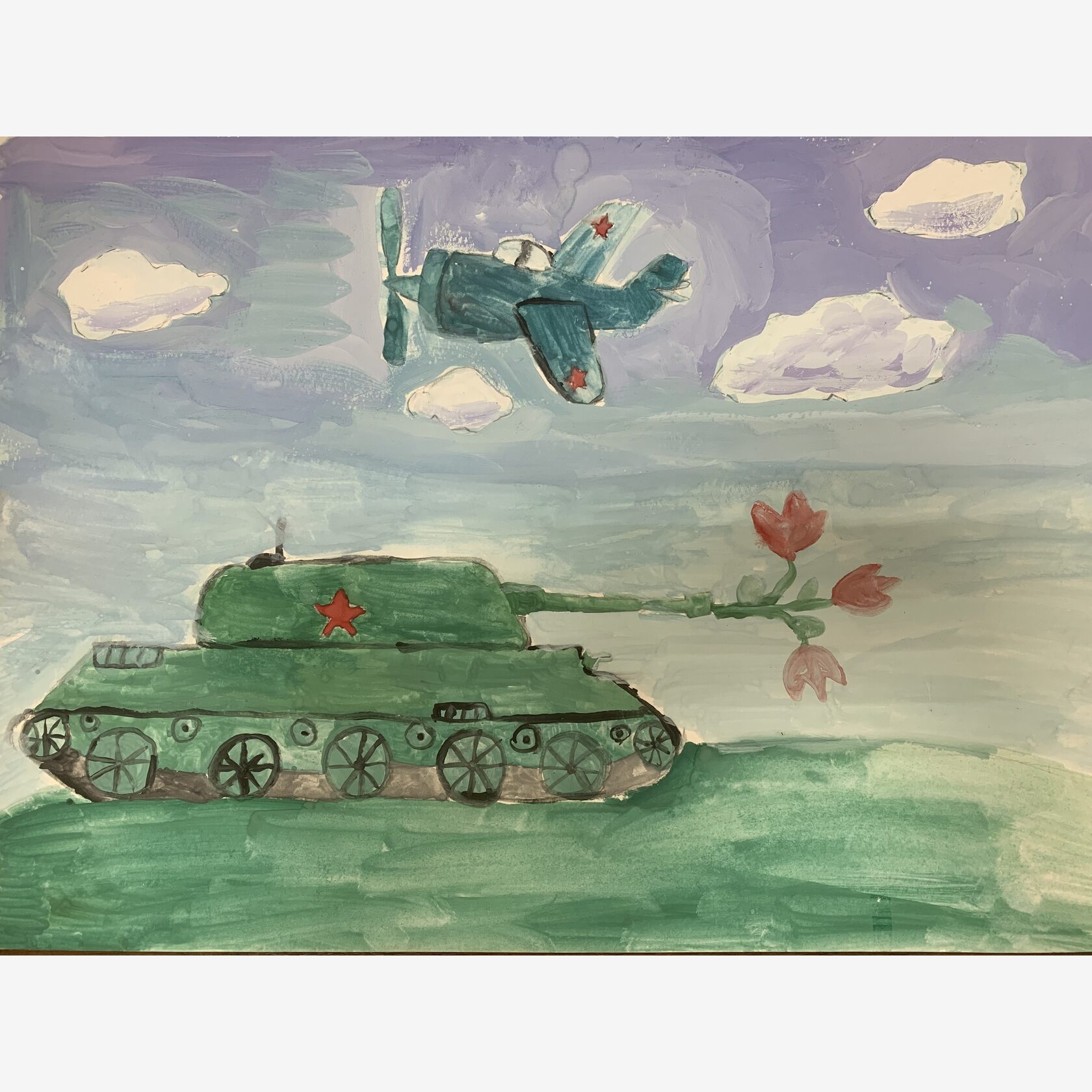На рисунке в небе летит самолет, а на земле идет танк , у которого из пушки вылетаю цветы вместо снарядов.