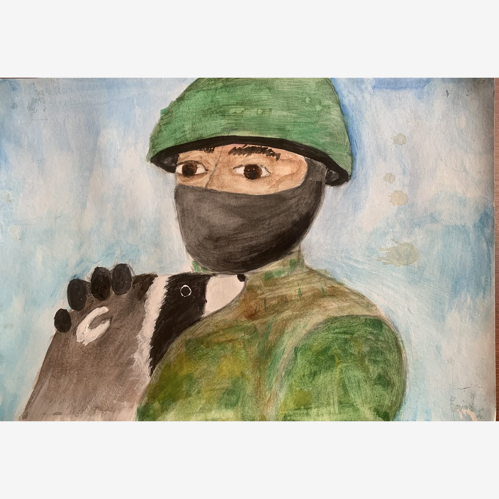 На рисунке изображен наш солдат с хорьком в руках, что символизирует доброту защитника Родины.