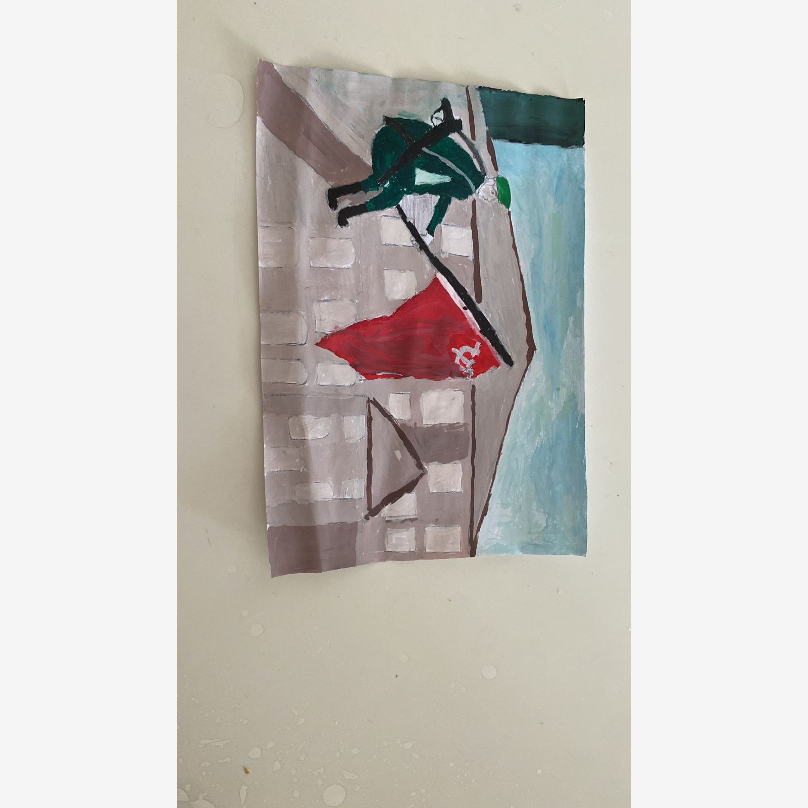 Здесь иллюстрируется поднятый Красный флаг который поднял солдат на крыше одного здания.