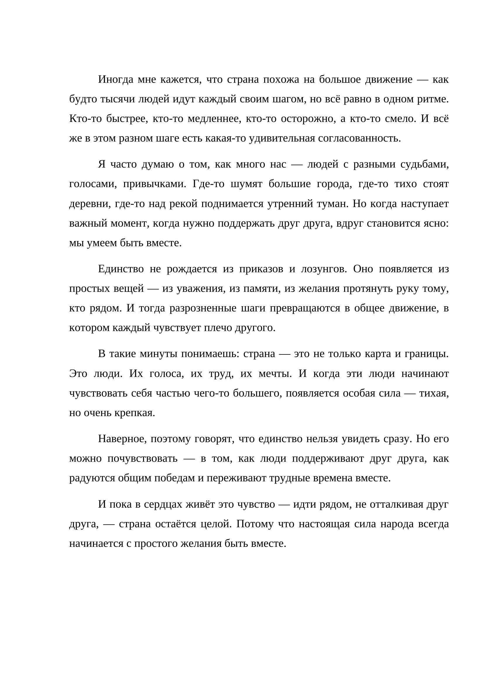 Философская проза о единстве людей и внутренней силе страны. Через образ общего ритма автор размышляет о том, как люди с разными судьбами, характерами и жизненными путями способны объединяться в важные моменты. В произведении подчёркивается, что единство рождается не из громких слов, а из уважения, взаимной поддержки и ощущения общей судьбы.