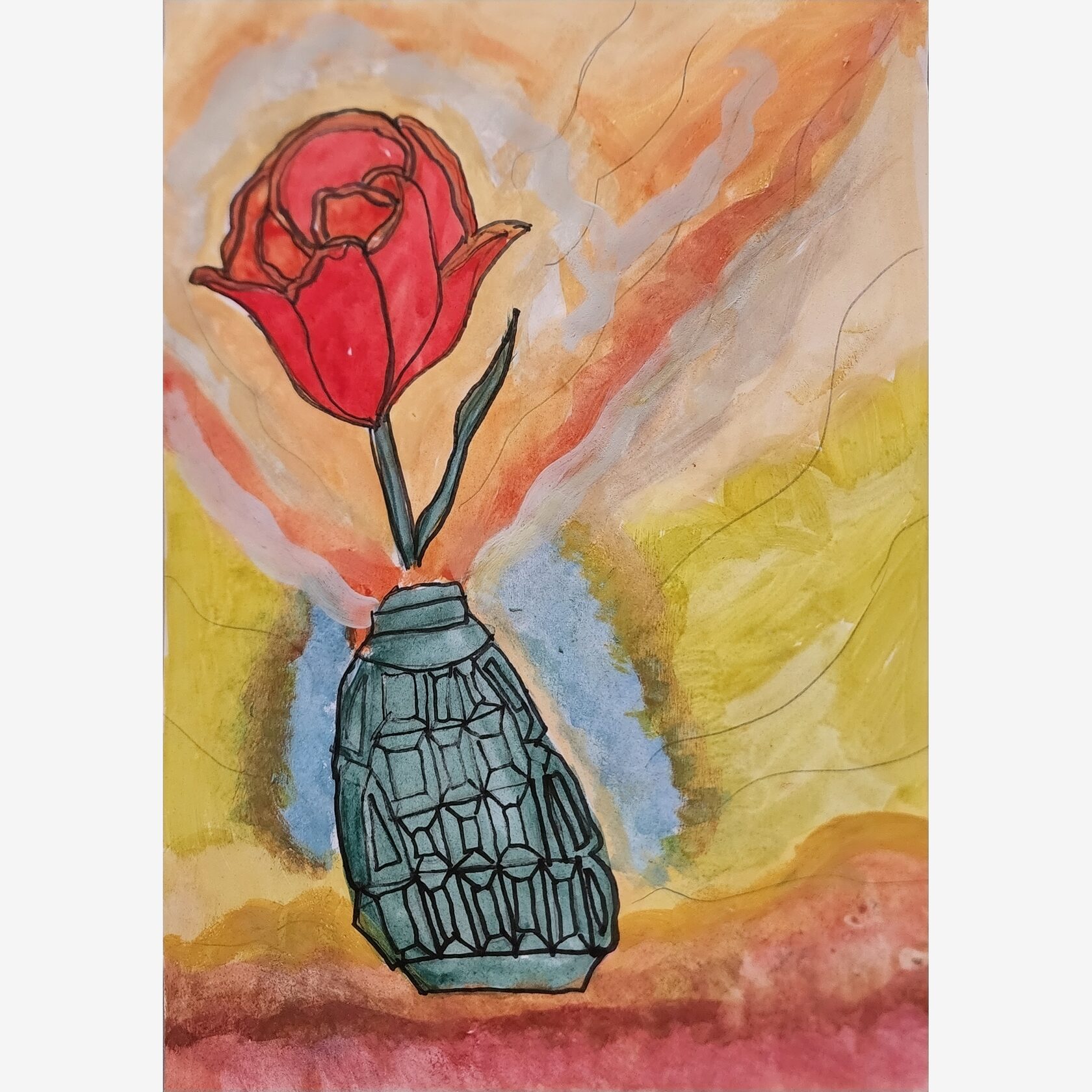 У Полины синдром Дауна, с детства она очень любит рисовать. Девушка занимается в Творческом доме "Солнечный Ангел". Полина - волонтер патриотического клуба "Ангелы для защитников". Работа "Вопреки войне" написана акварелью.