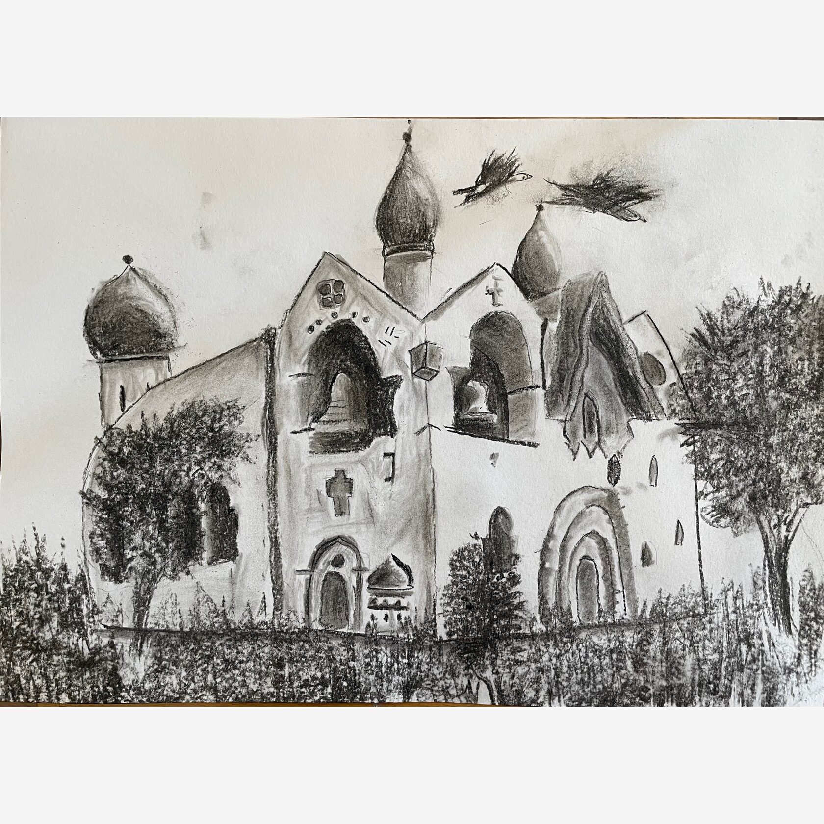 В своём рисунке я изобразил храм Спаса Преображения на Нередице — выдающийся памятник древнерусского зодчества, возведённый в 1198 году по заказу князя Ярослава Владимировича. Эта православная святыня стала жертвой боевых действий 1941 года: артиллерийские обстрелы разрушили купол, барабан и своды; уцелели лишь остатки стен (до 3 м высотой), часть апсид и северо-западный угол; было утрачено 85% уникальной фресковой росписи XII века (сохранились лишь фрагменты «Святой Юлиании», «Страшного суда» и ктиторская фреска с изображением князя Ярослава). Чудесное возрождение этой православной святыни началось благодаря труду многих поколений реставраторов. Работы начались сразу после освобождения Новгорода и завершились в 2004 году. Храм Спаса Преображения на Нередице – символ сохранения исторического наследия и силы человеческой воли, способной вернуть к жизни даже то, что казалось утраченным Великой Отечественной войной навсегда.
