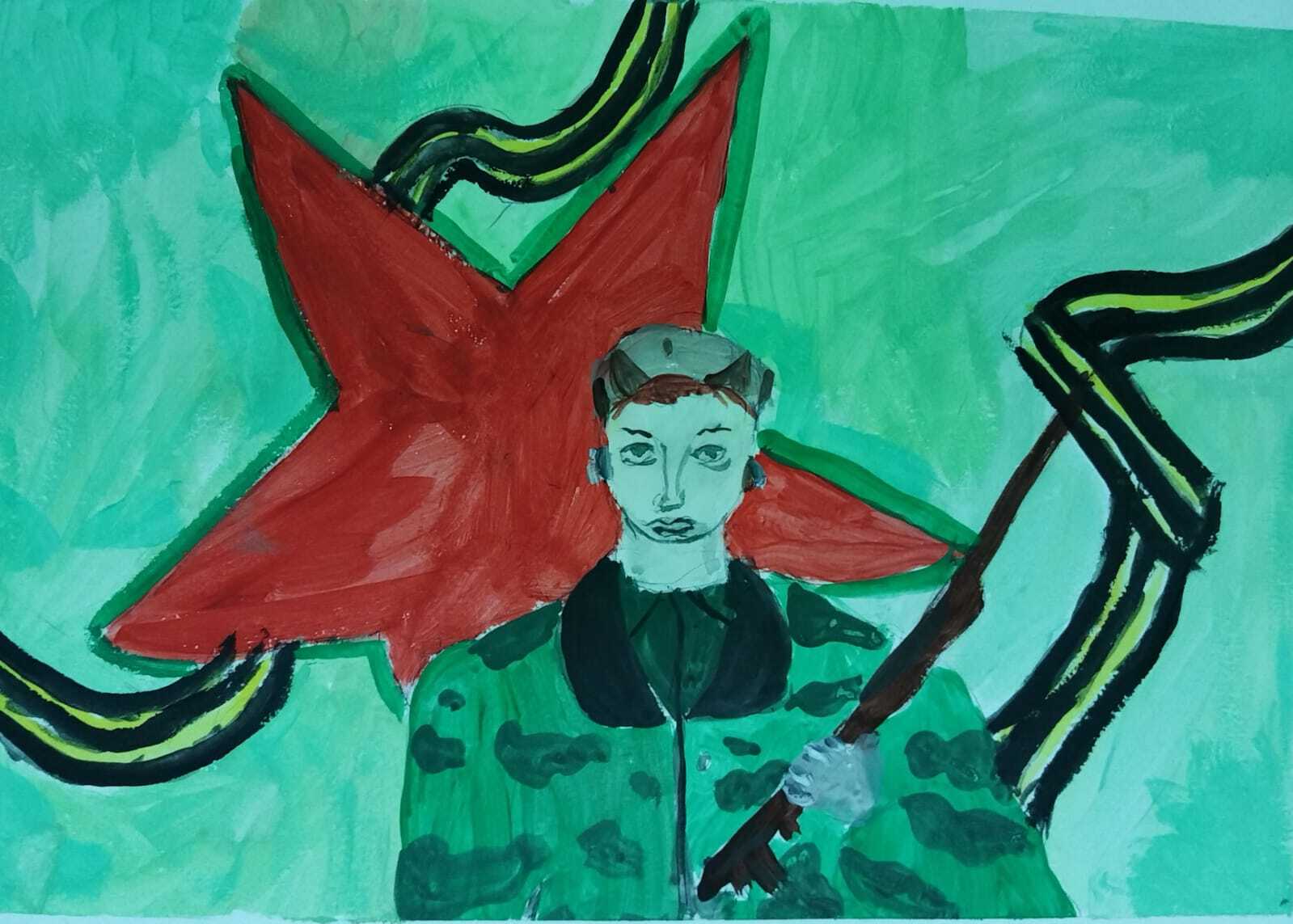 Автор - Попова Настя, 9 лет. "У моего героя пронзительный взгляд, руки крепко сжимают оружие. Этот воин олицетворяет силу, отвагу и несгибаемую волю народа. Красная звезда за его спиной – символ победы, а Георгиевская лента – знак славы и памяти. Я горжусь нашей Победой!".