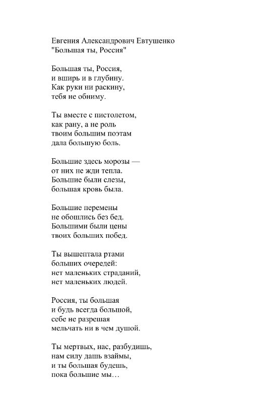Стихотворение Е.А. Евтушенко "Большая ты, Россия".