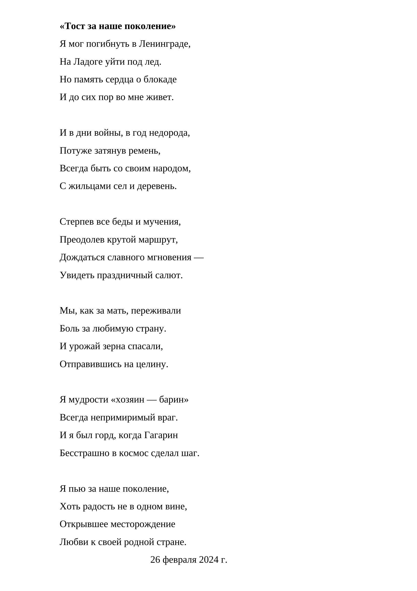 Стихотворение «Тост за наше поколение» — это лирический монолог человека, пережившего войну и блокаду Ленинграда. В его памяти живы ужасы прошлого, голод и испытания, но он гордится тем, что всегда был со своим народом, разделяя с ним тяготы и радости.