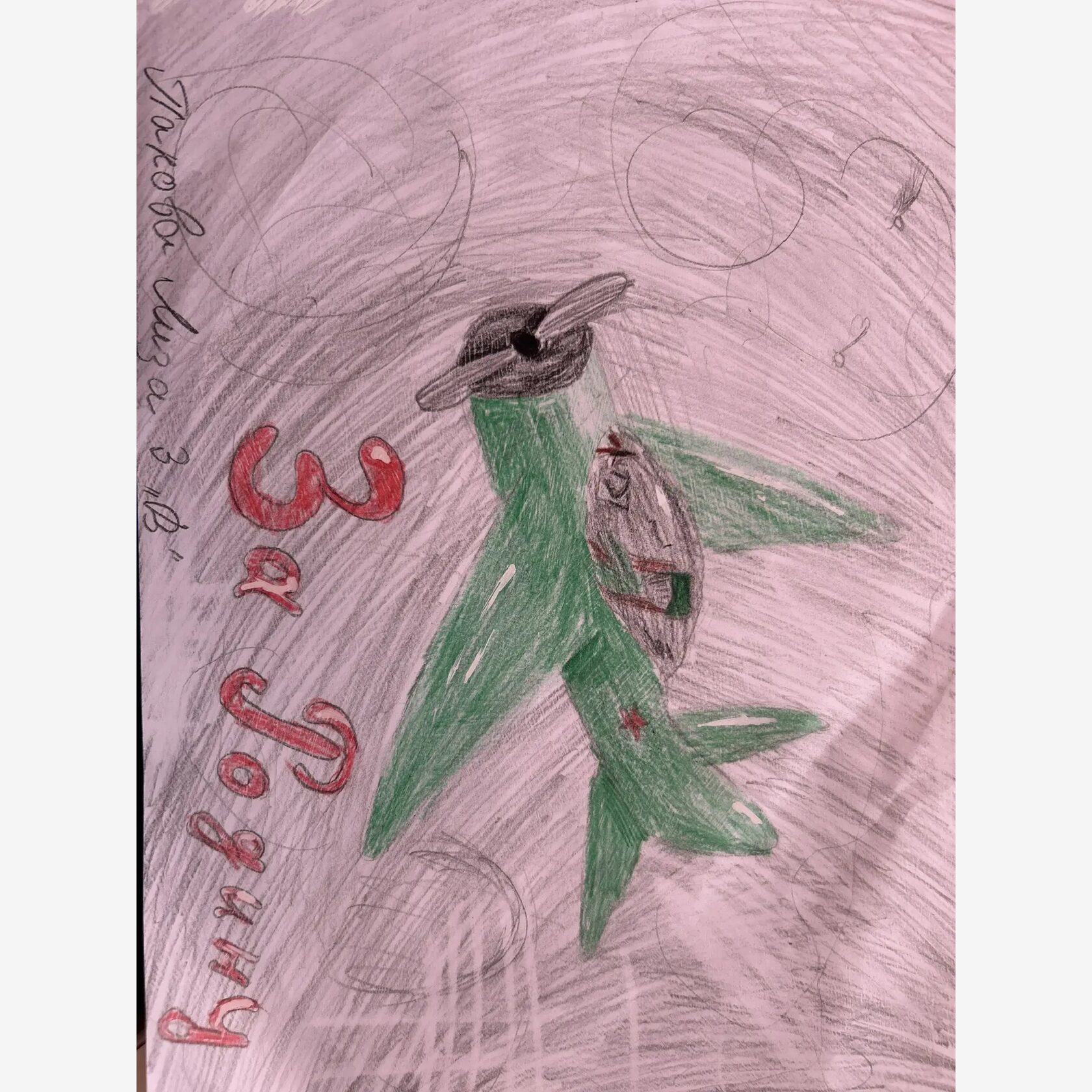 На рисунке изображен военный самолет, стремительно летящий в небе. Само небо серого цвета, потому что идет война: все в дыму. Надпись "За Родину" гласит о том, что летчик готов пожертвовать собой, чтобы спасти Родину. Он настоящий патриот своей страны.