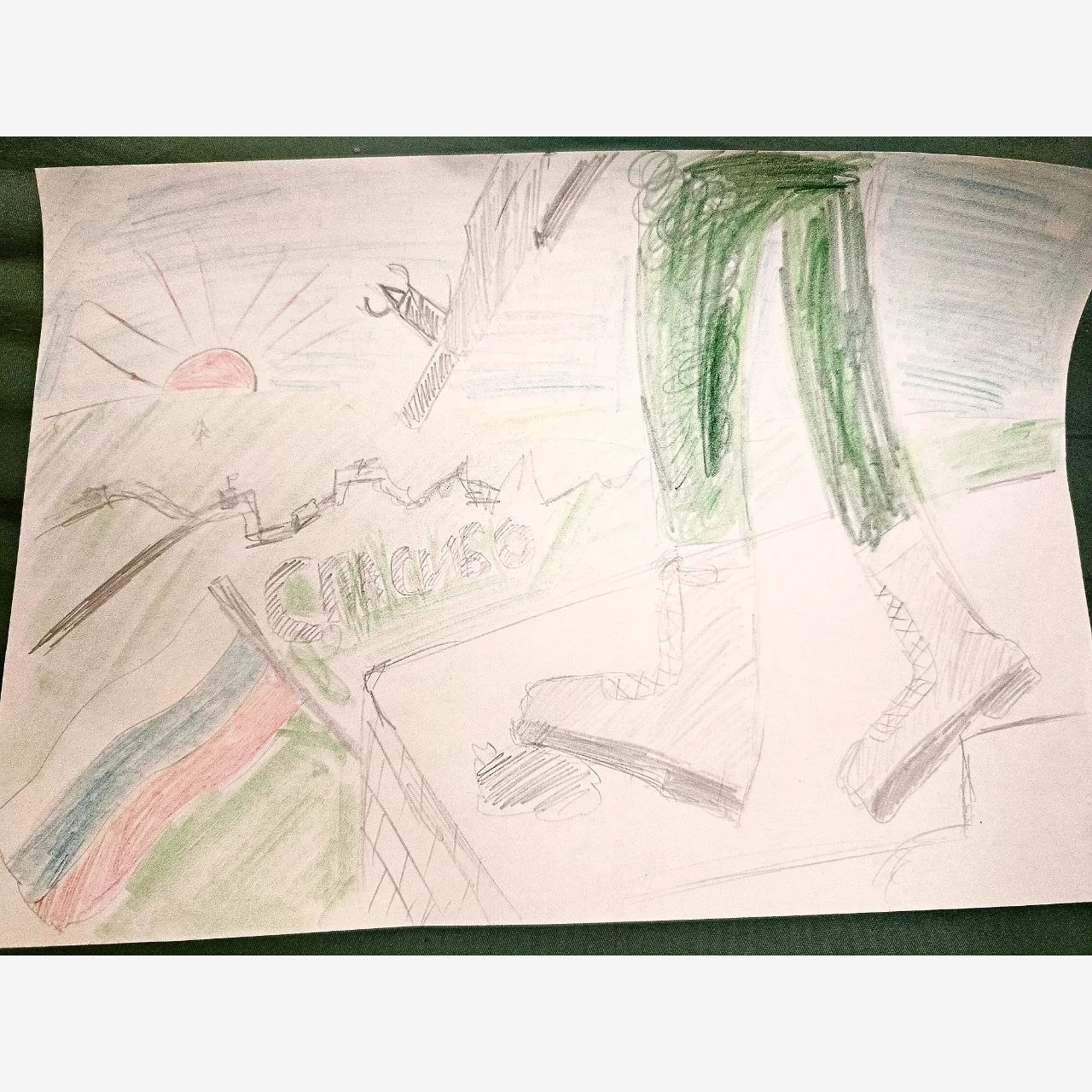 Российский флаг устанавливают на вновь присоединенных территориях. В правой части картин видны берцы русского солдата.