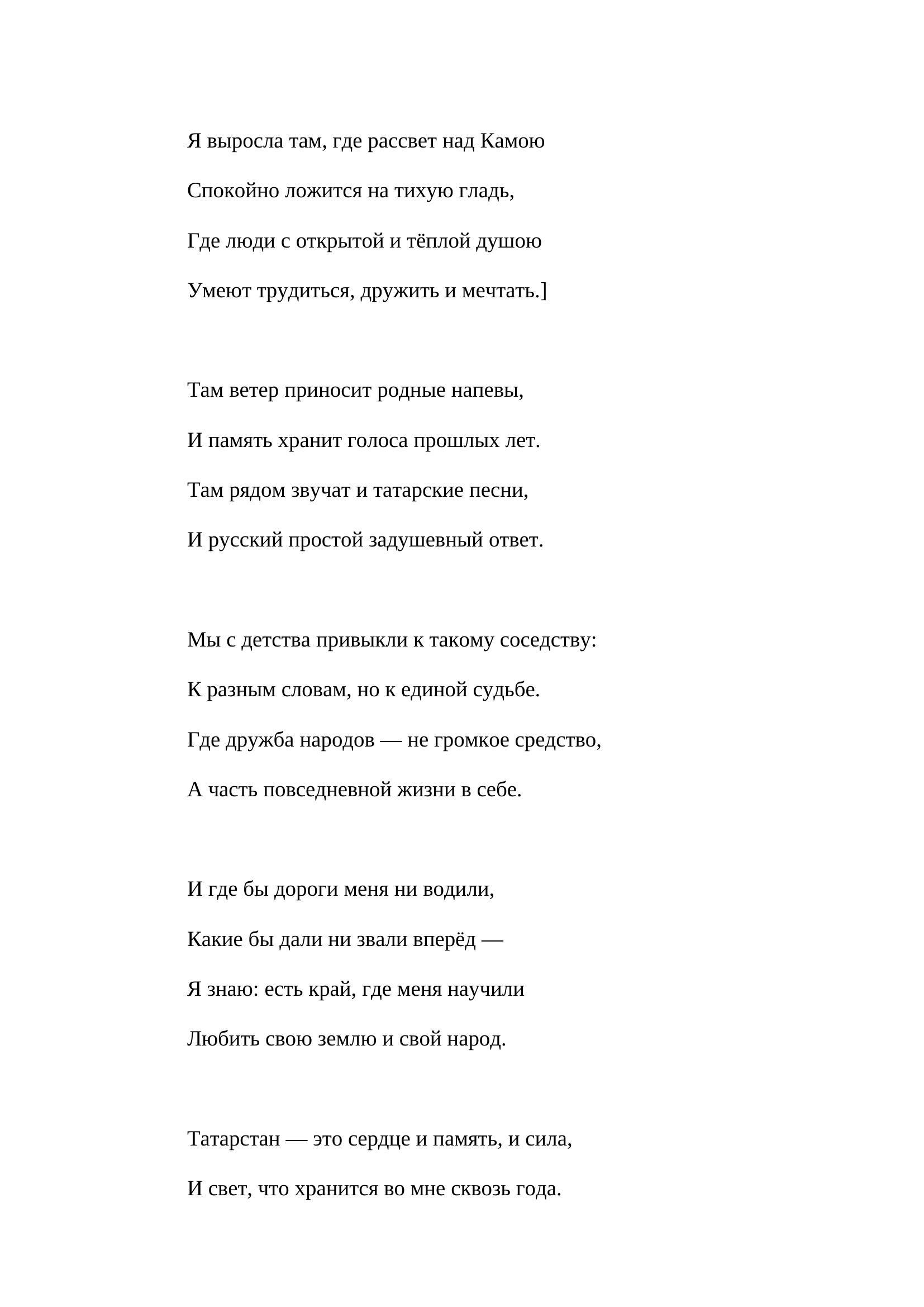 В строках звучит любовь к родной земле, к её природе, культуре и людям. Через образы реки Камы, народных песен и тёплой атмосферы родного края передаётся чувство единства народов, которые веками живут рядом, сохраняя свои традиции и уважение друг к другу. Произведение отражает мою связь с родиной и подчёркивает, что Татарстан — важная и неотъемлемая часть большой и многогранной России.