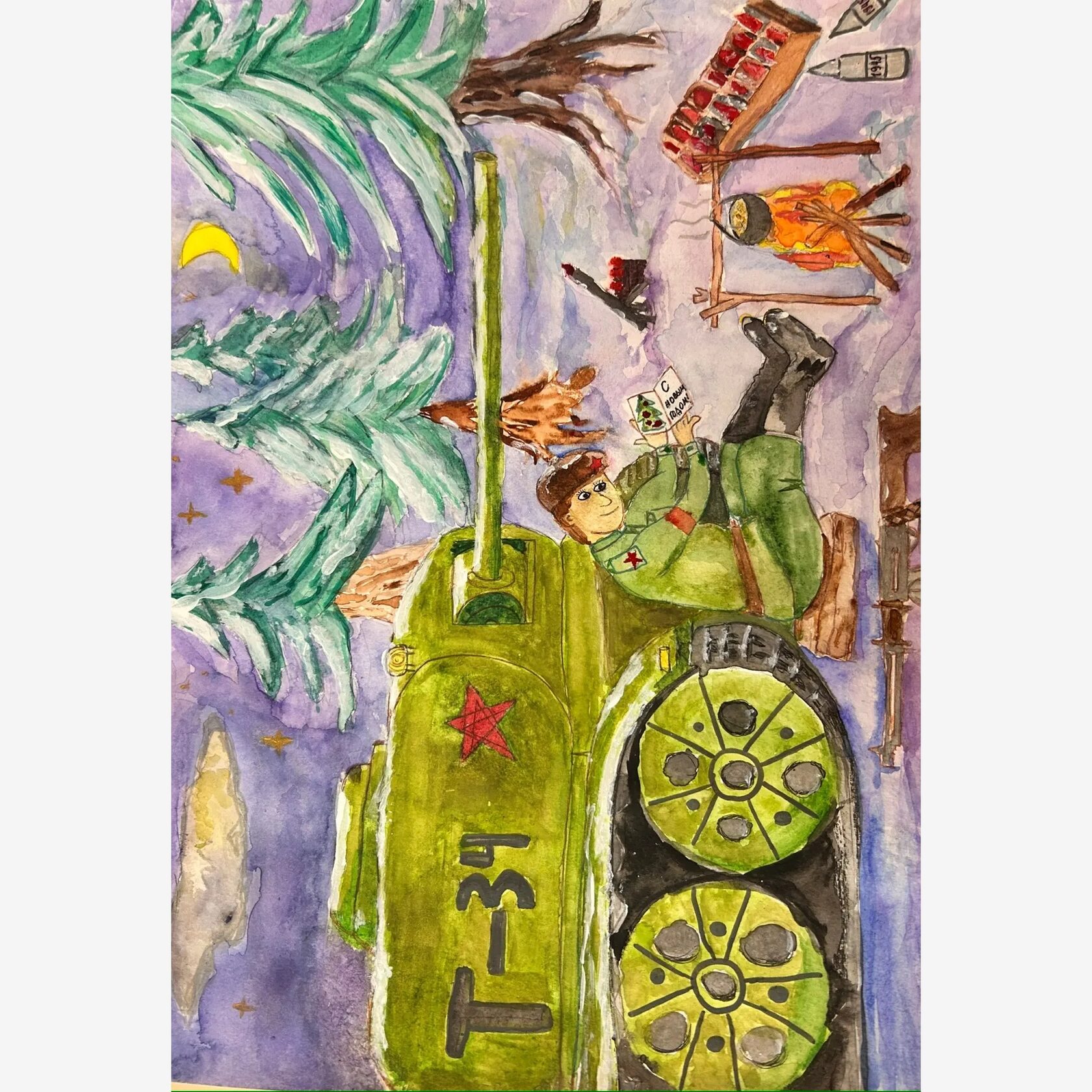 На передовой, в зимнюю ночь, у костра сидит военный. У него в руках поздравительная открыта от его дочери. Лицо солдата освещено теплым светом огня, и замерло в улыбке.