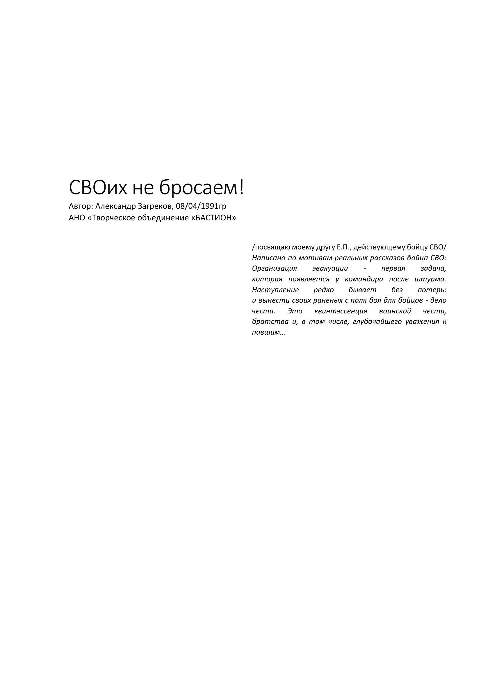 "СВОих не бросаем!" / стих-посвящение другу - бойцу СВО Автор: Александр Загреков, АНО "Творческое объединение "Бастион" О произведении: посвящаю моему другу Е.П., действующему бойцу СВО. Организация эвакуации - первая задача, которая появляется у командира после штурма. Наступление редко бывает без потерь: и вынести своих раненых с поля боя для бойцов - дело чести. Это квинтэссенция воинской чести, братства и, в том числе, глубочайшего уважения к павшим…