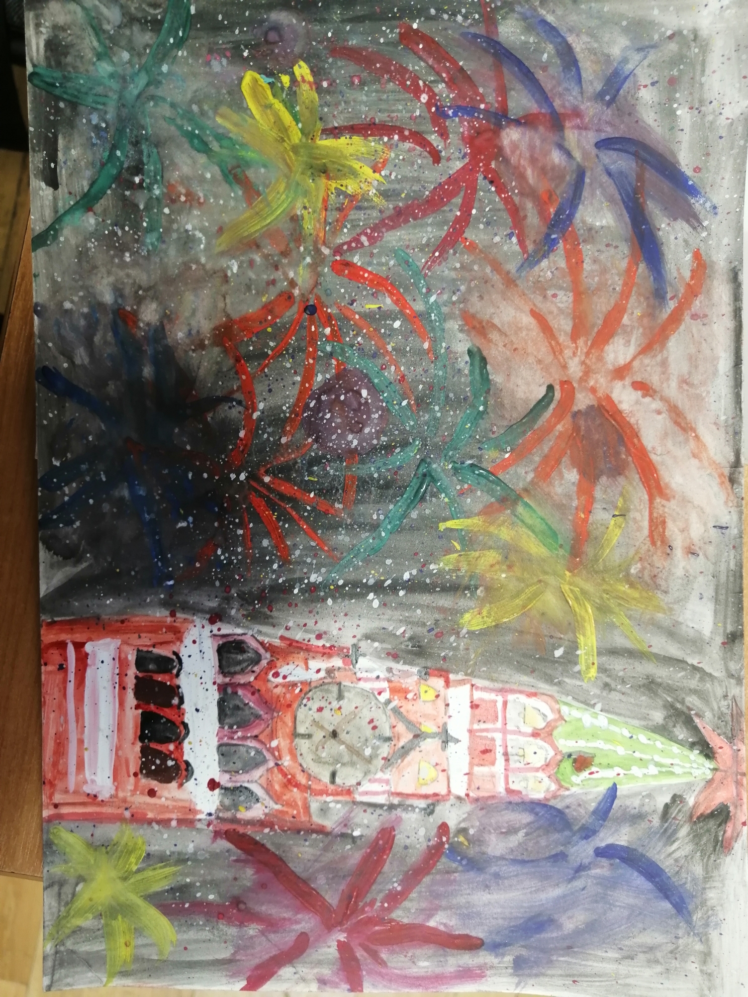 Ученица нарисовала праздничный салют в честь празднования 9 мая.