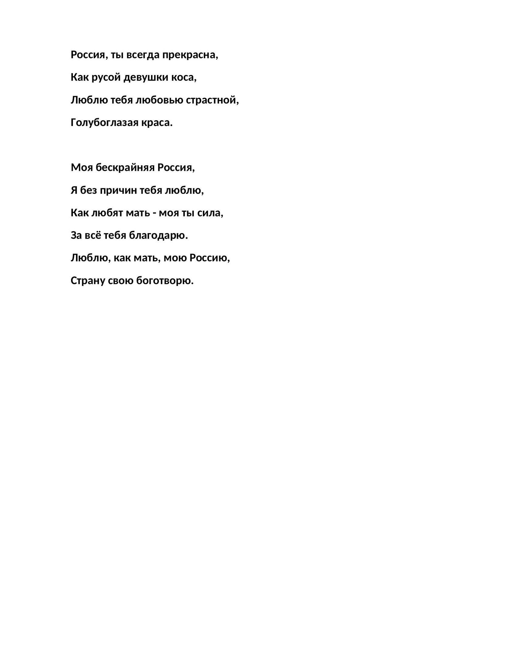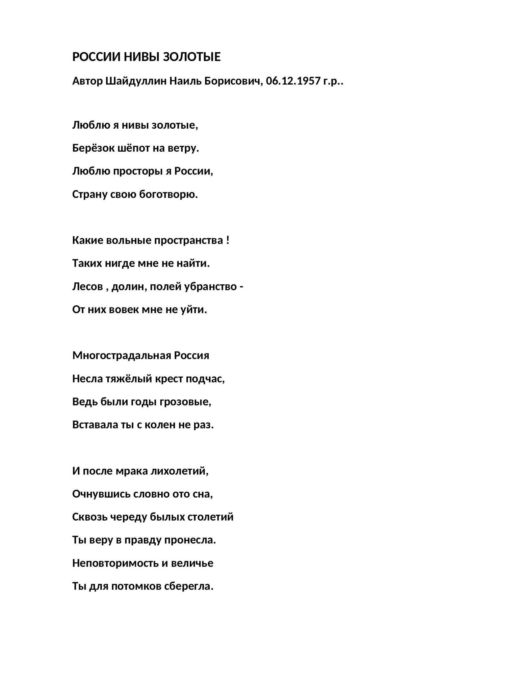 РОССИИ НИВЫ ЗОЛОТЫЕ Стихотворение о любви к России. Автор Наиль Шайдуллин, 06.12.1957 г.р.. Люблю я нивы золотые, Берёзок шёпот на ветру. Люблю просторы я России, Страну свою боготворю. Какие вольные пространства ! Таких нигде мне не найти. Лесов , долин, полей убранство - От них вовек мне не уйти. Многострадальная Россия Несла тяжёлый крест подчас. Ведь были годы грозовые, Вставала ты с колен не раз. И после мрака лихолетий, Очнувшись словно ото сна, Сквозь череду былых столетий Ты веру в Правду пронесла. Неповторимость и величье Ты для потомков сберегла. Россия, ты всегда прекрасна, Как русой девушки коса. Люблю тебя любовью страстной, Голубоглазая краса. Моя бескрайняя Россия, Я без причин тебя люблю, Как любят мать - моя ты сила, За всё тебя благодарю. Люблю, как мать, мою Россию, Страну свою боготворю.