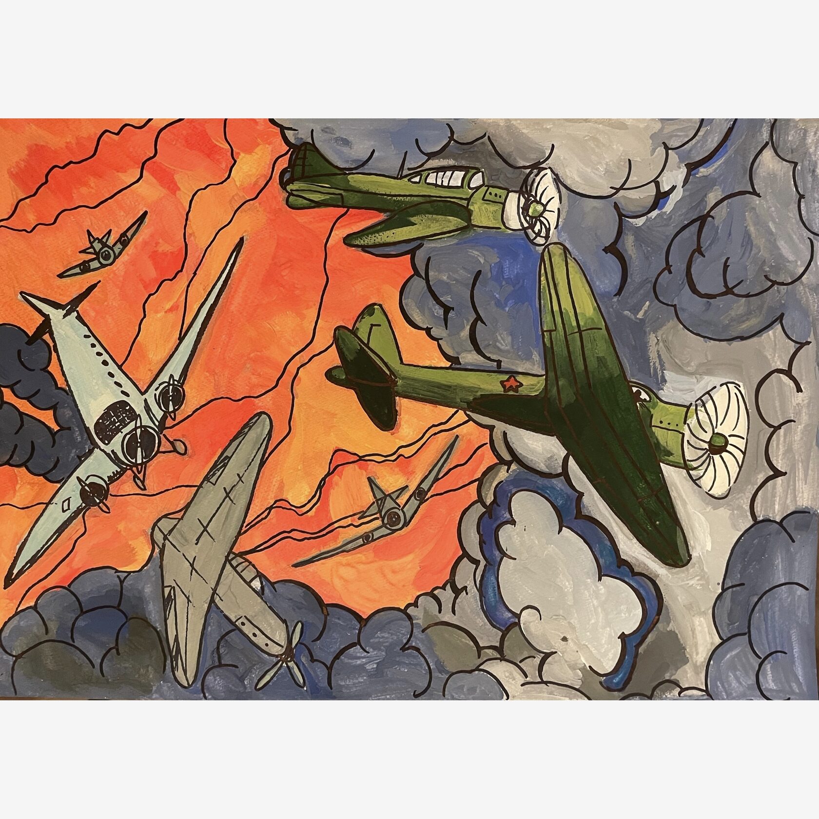 В год 85-летия битвы под Москвой я посвящаю свою работу героизму советских лётчиков, защищавших небо Москвы в самые тяжёлые дни осени и зимы 1941 года. В период с 30 сентября 1941 г. по 20 апреля 1942 г. советские лётчики отразили более 122 налётов на столицу, сбив около 1300 вражеских самолётов. Героические подвиги, такие как ночной таран Виктора Талалихина 7 августа 1941 г., стали символом мужества и самоотверженности. Авиация не только защищала небо над Москвой, но и поддерживала наземные войска, нанося удары по вражеским колоннам, аэродромам, коммуникациям. В боях за столицу участвовали как современные на тот момент самолёты (Як-1, МиГ-3, ЛаГГ-3, Пе-2, Ил-2), так и устаревшие модели (По-2, Р-5, СБ, ТБ-3), что подчёркивает массовый героизм и сплочённость защитников. Моя работа «Сквозь огненные облака: защита Москвы» - визуальный рассказ о подвиге, о том, как мужество, мастерство и единство защитников Москвы сорвали планы врага, остановили наступление вермахта и положили начало коренному перелому в войне.