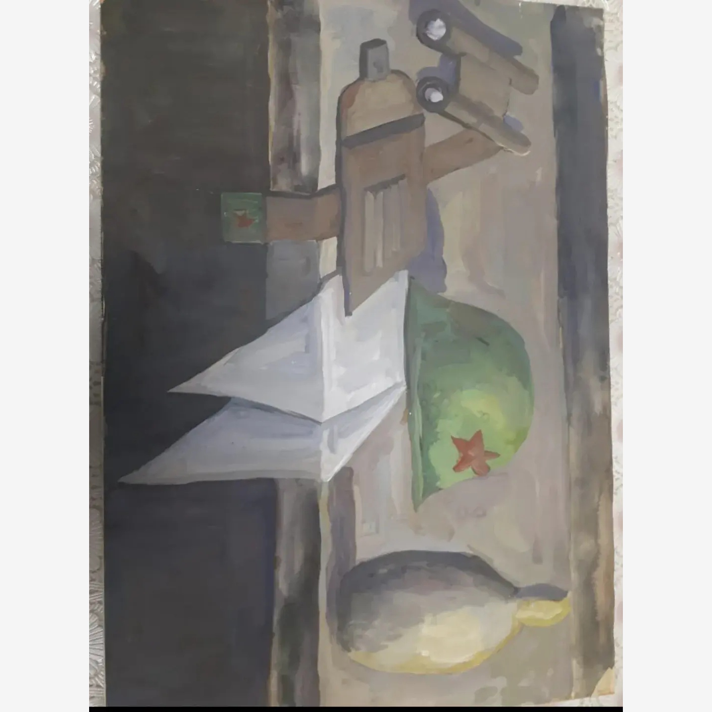 Картина "Военный натюрмот" написана гуашью. По описанию ребенка здесь солдат готовился к военному заданию