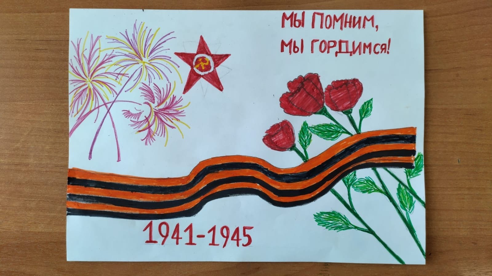 Цветы Победы у священной ленты. Салют над эмблемой славы. «1942-1945: помню и горжусь!»