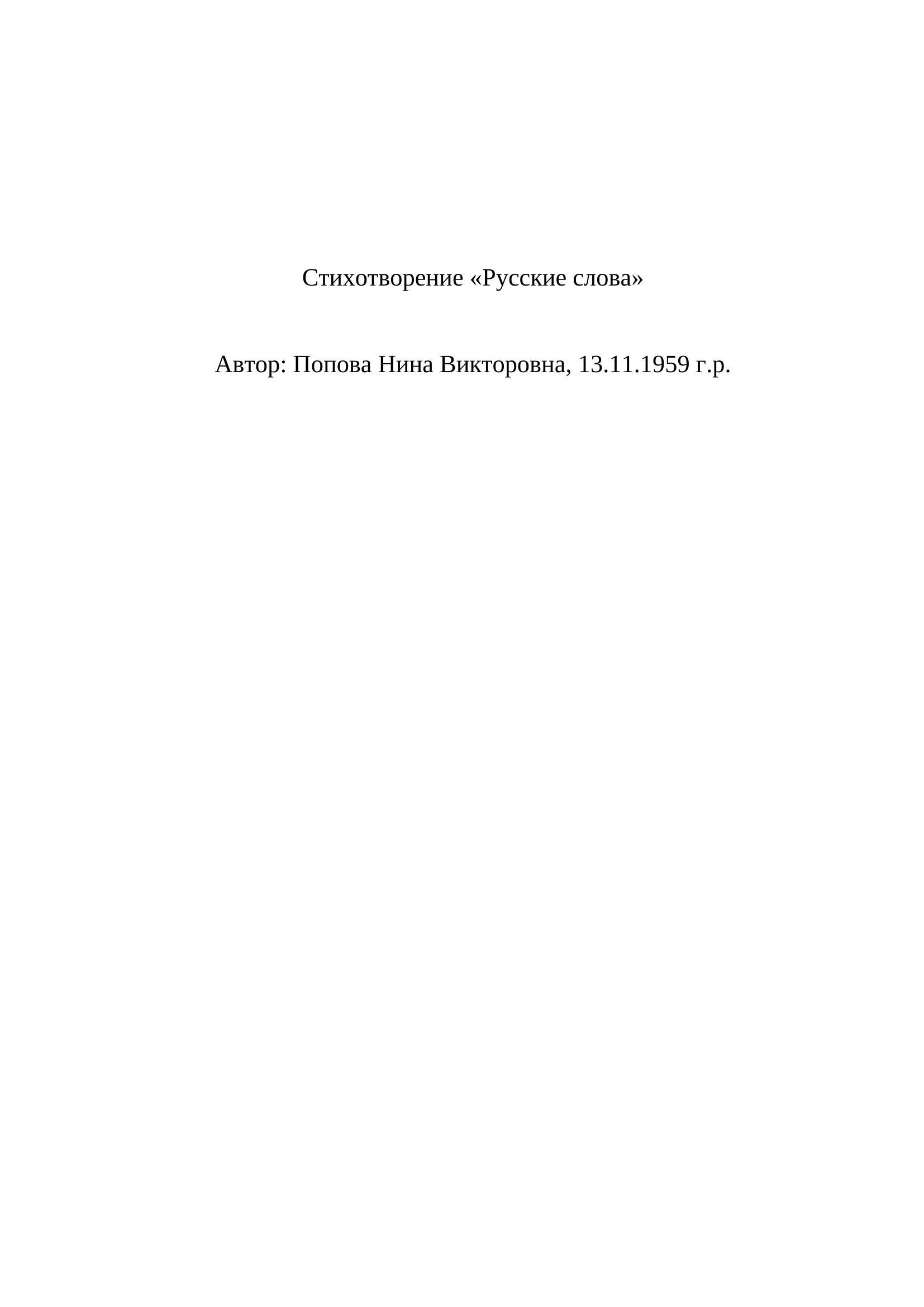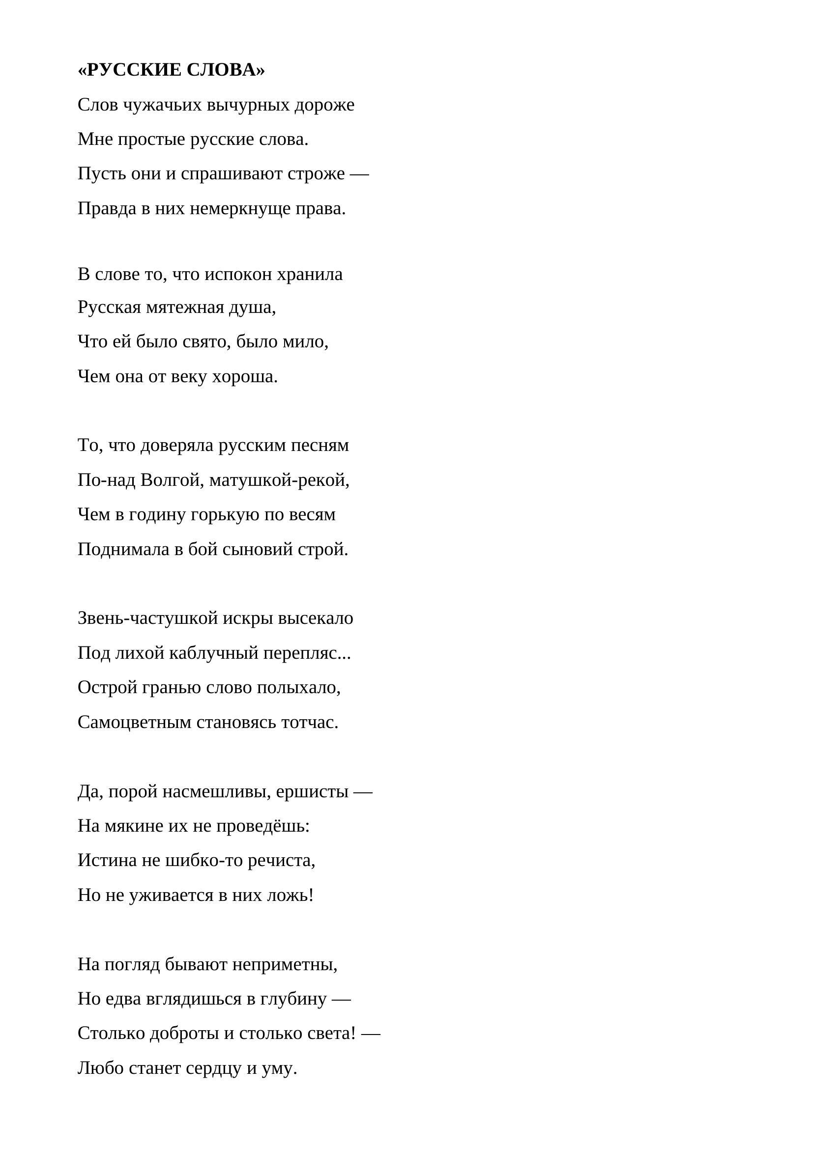 В стихотворении «Русские слова» глубоко выражена любовь и уважение к родному языку. Простые русские слова хранят в себе правду, душу народа, его историю и традиции. Они звучат в песнях, поднимают дух в трудные времена, искрятся в частушках и плясках.