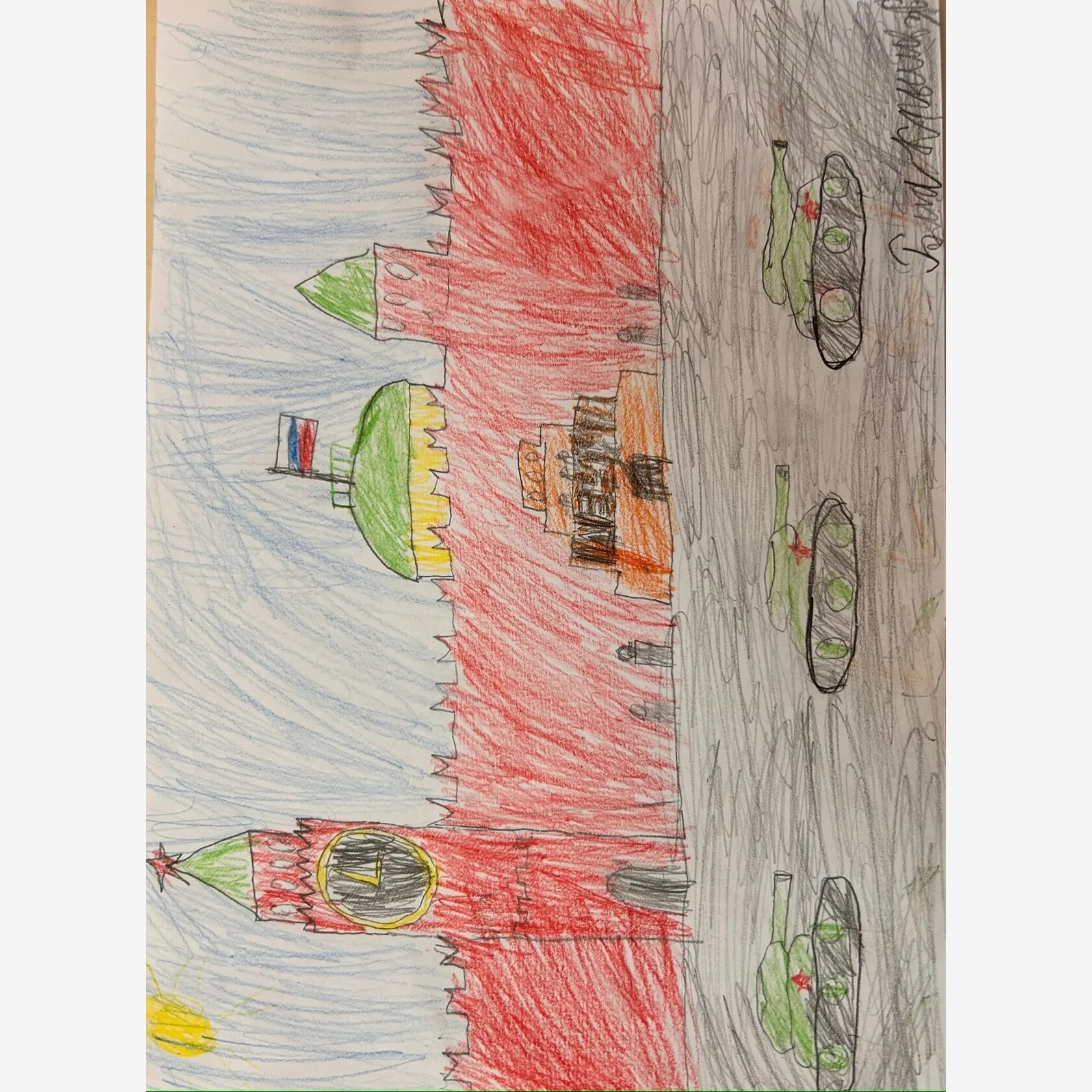 На рисунке изображен военный парад на Красной площади. По брусчатке торжественно едут танки. Величественный Кремль подчеркивает историческую значимость события.