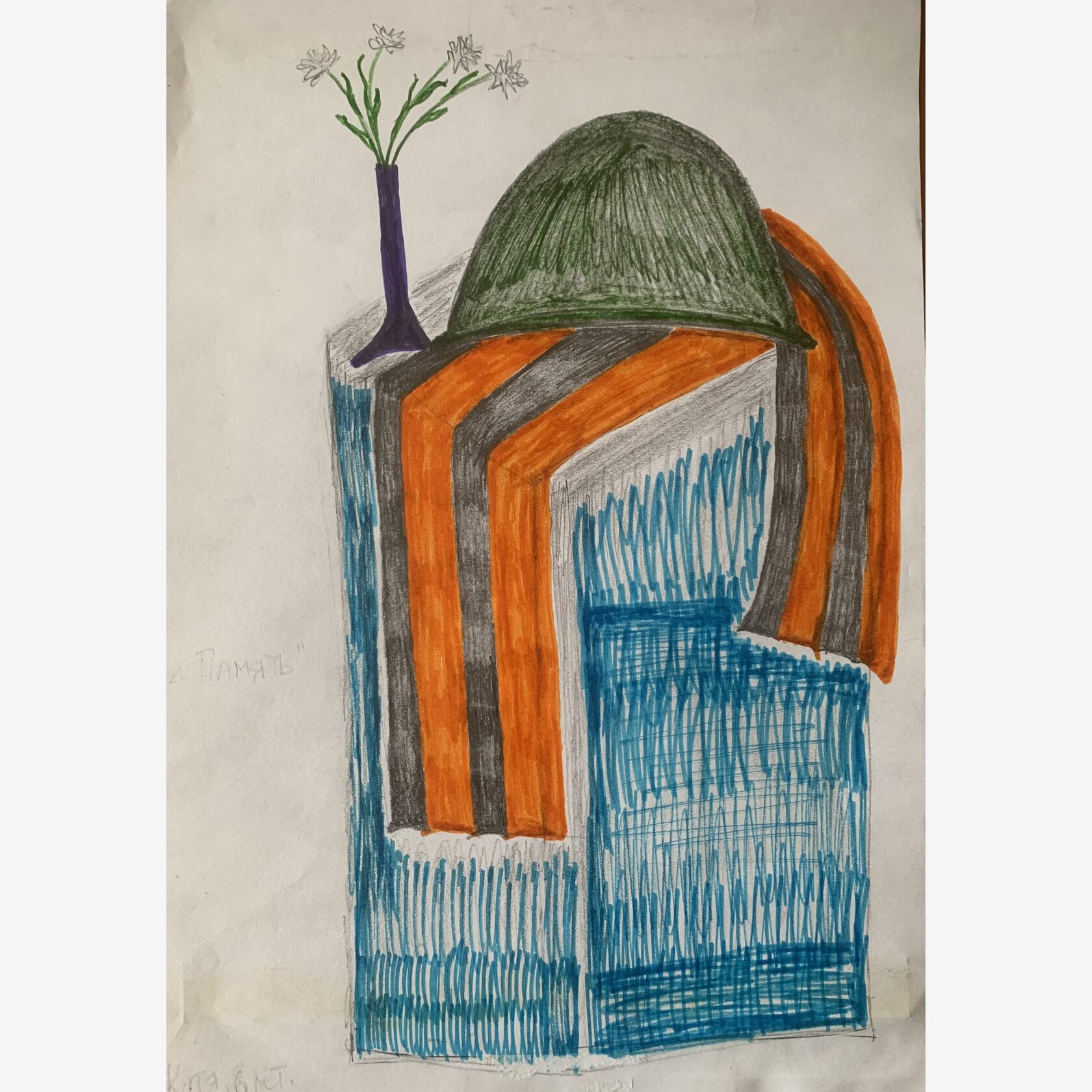 На рисунке изображены каска солдата и георгиевская лента на постаменте.