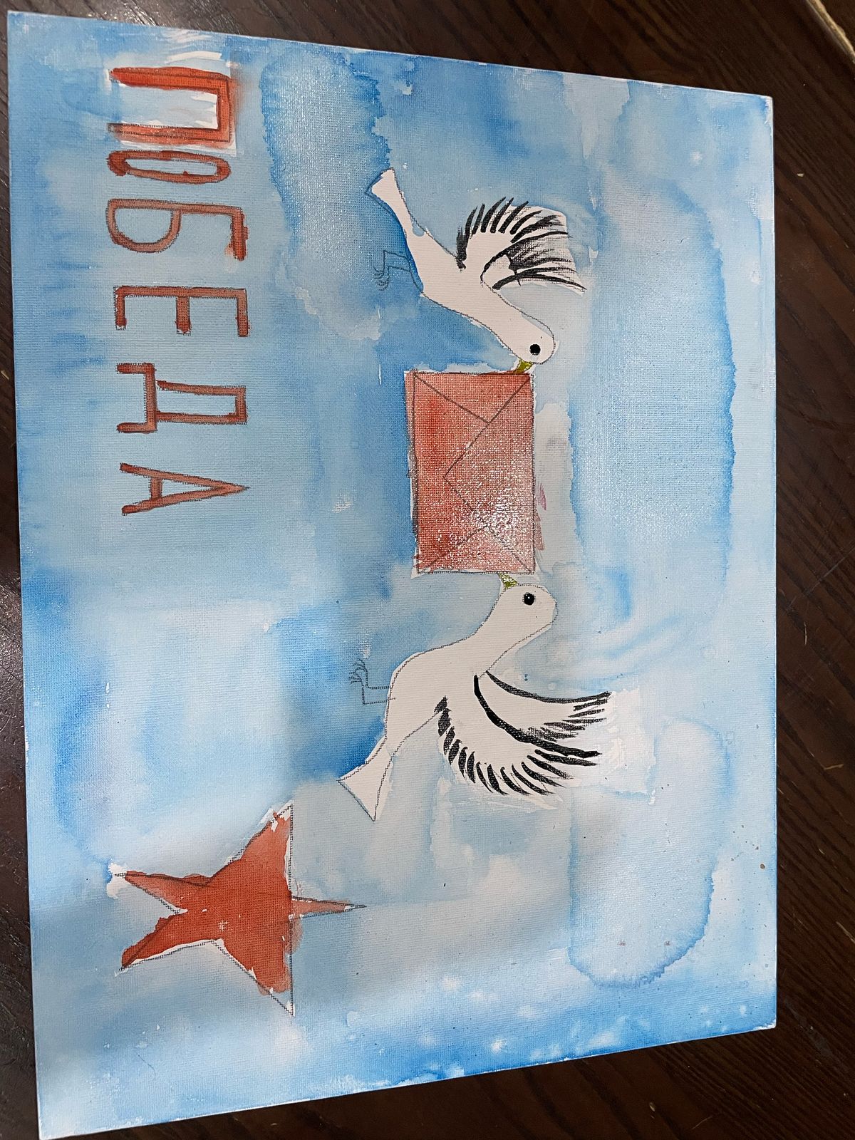 У Максима синдром Дауна, он занимается в АНО Творческий Дом "Солнечный Ангел", является волонтером патриотического клуба. Эта работа - символ писем и открыток, которые Максим пишет на передовую с другими солнечными ребятами.