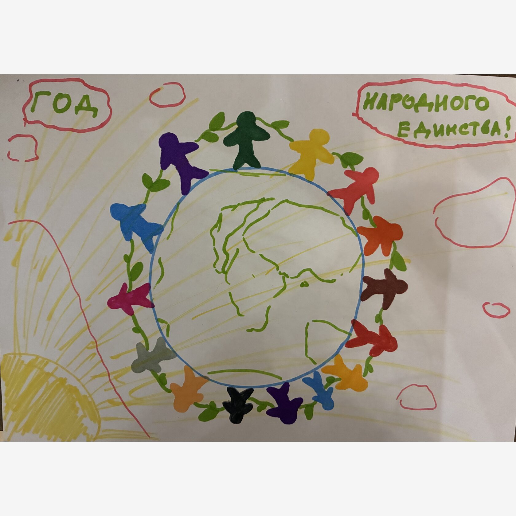 Я нарисовала Землю, вокруг которой держатся за руки люди разных цветов. Это значит, что все люди на планете разные, но могут дружить и жить в мире. Листочки — это как символ жизни и роста, а солнце — что всё это происходит в добром и светлом мире. Мне хотелось показать, что единство — это когда все вместе, несмотря на различия.
