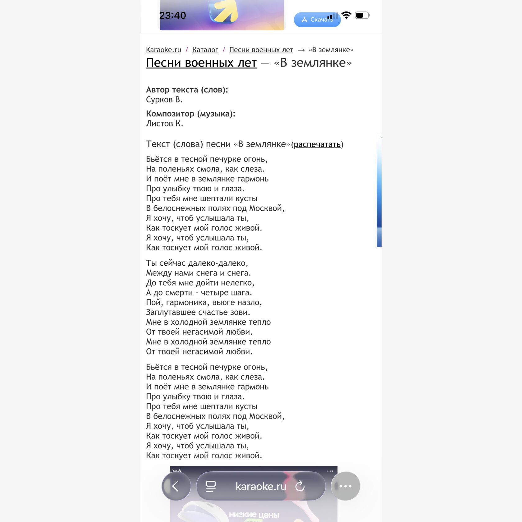Песня военных лет. Автор слов Сурков А. А.