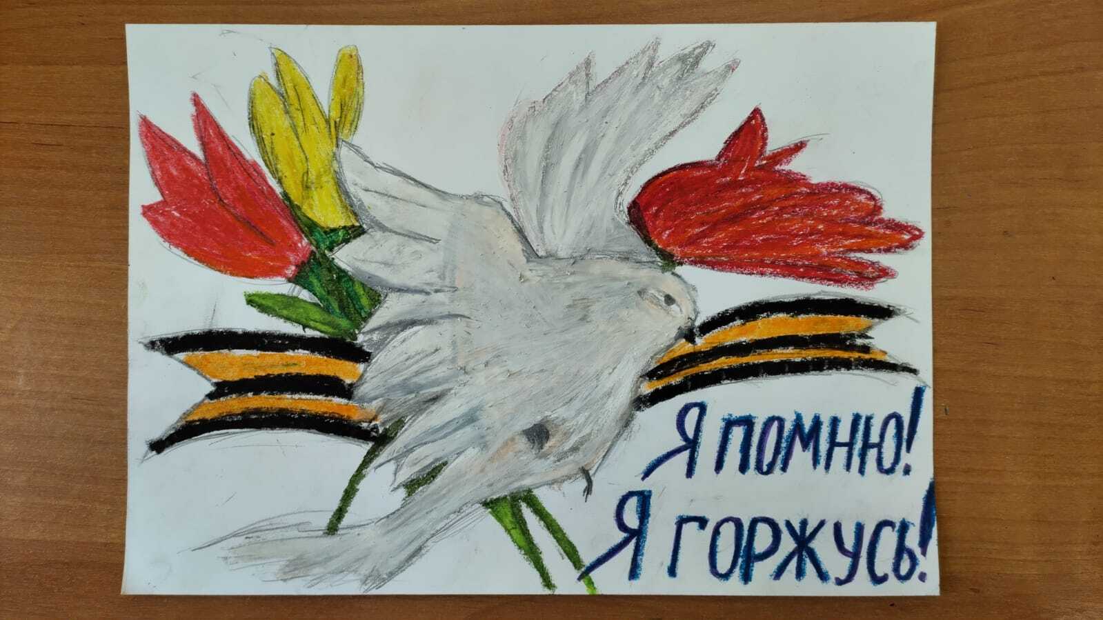 Алеют цветы, голубь мира взлетает. Георгиевская лента и гордая надпись: «Я помню, я горжусь!