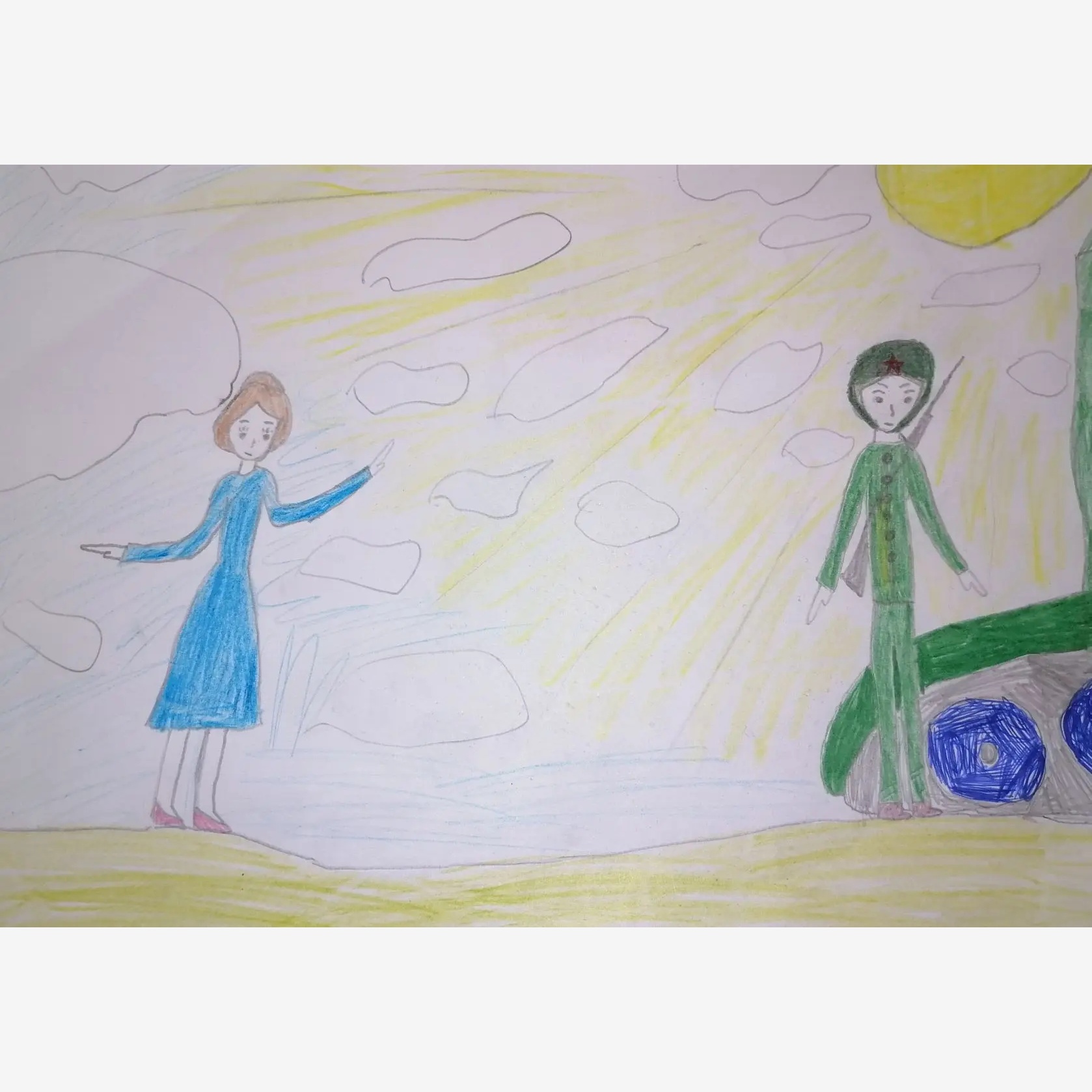 Солдат и его возлюбленная прощаются. Рядом уже стоит машина, которая скоро увезет на фронт будущего участника боевых действий. Солнце заливает лучами печальную картину.