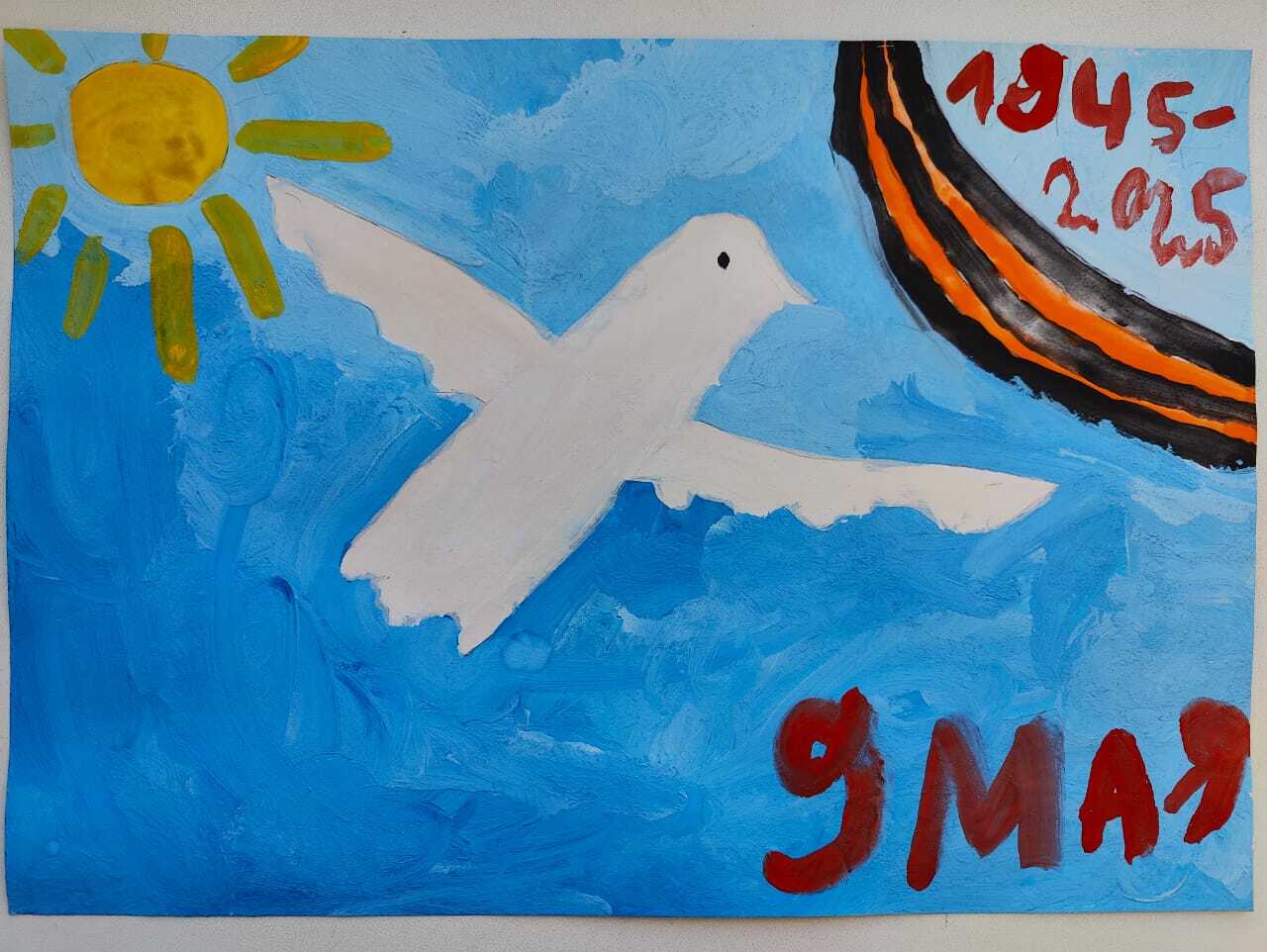 Художественная работа "Мирное небо" выполнена учащимся 4 класса. Иван обучается по адаптированной основной общеобразовательной программе для обучающихся с умственной отсталостью (интеллектуальными нарушениями), вариант 9.1. Работа выполнена гуашью. Формат А3.