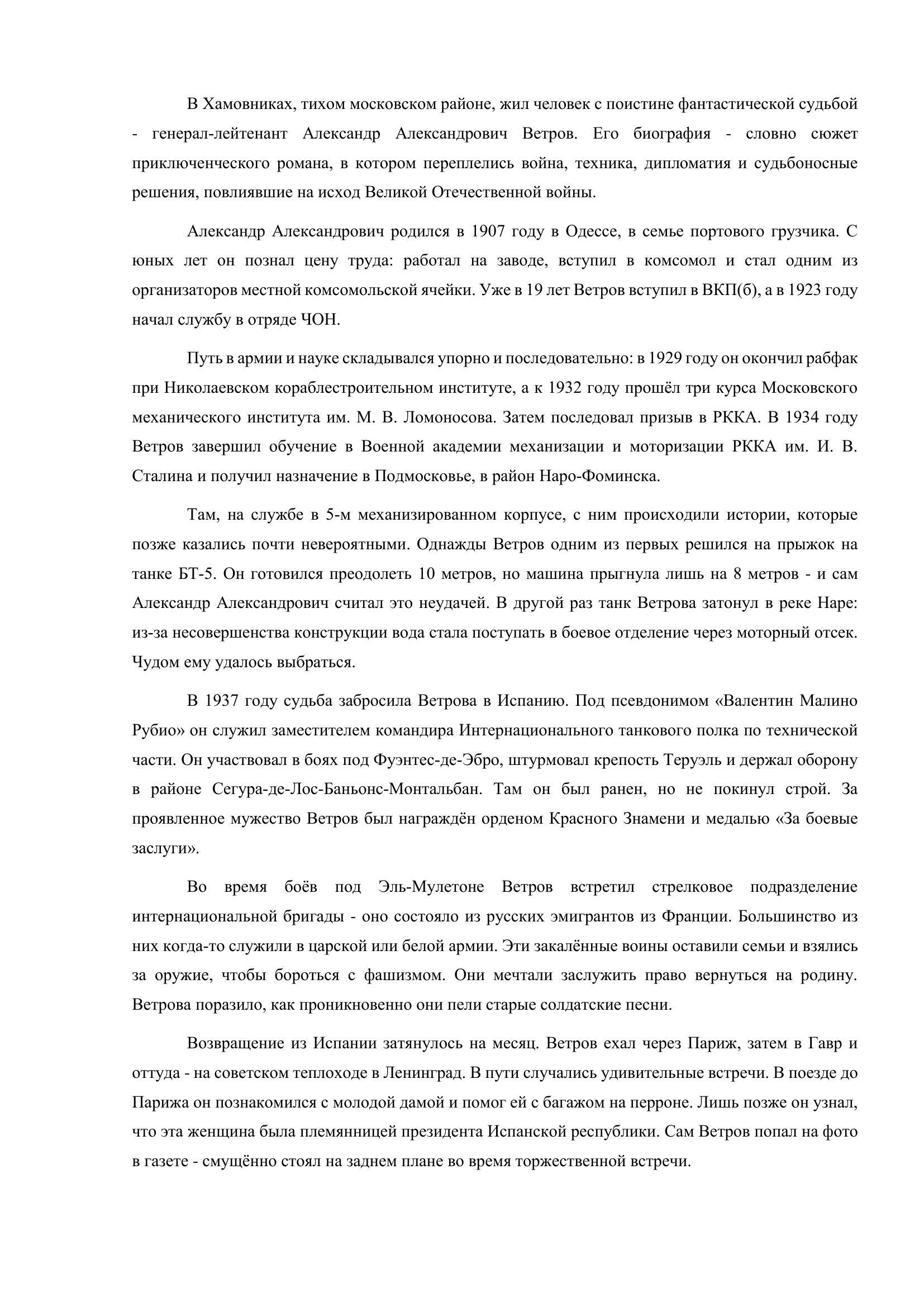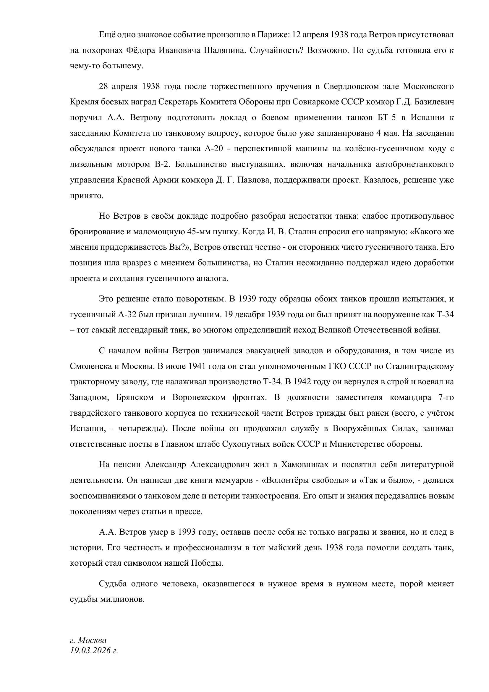 Рассказ (очерк) о жизни генерал-лейтенанта Ветрове Александре Александровиче (1907-1993), участнике Гражданской войны в Испании и Великой Отечественной войне, жителе района Хамовники. Центральным местом повествования и причиной написания данного произведения являются малоизвестные события 4 мая 1938 - дня проведения заседания Комитета обороны при Совнаркоме СССР по танковому вопросу. Доклад Ветрова А.А. и его принципиальная позиция коренным образом повлияли на итоговое решение комитета и в целом на вектор развития отечественного танкостроения, который привел к принятию на вооружение среднего танка Т-34